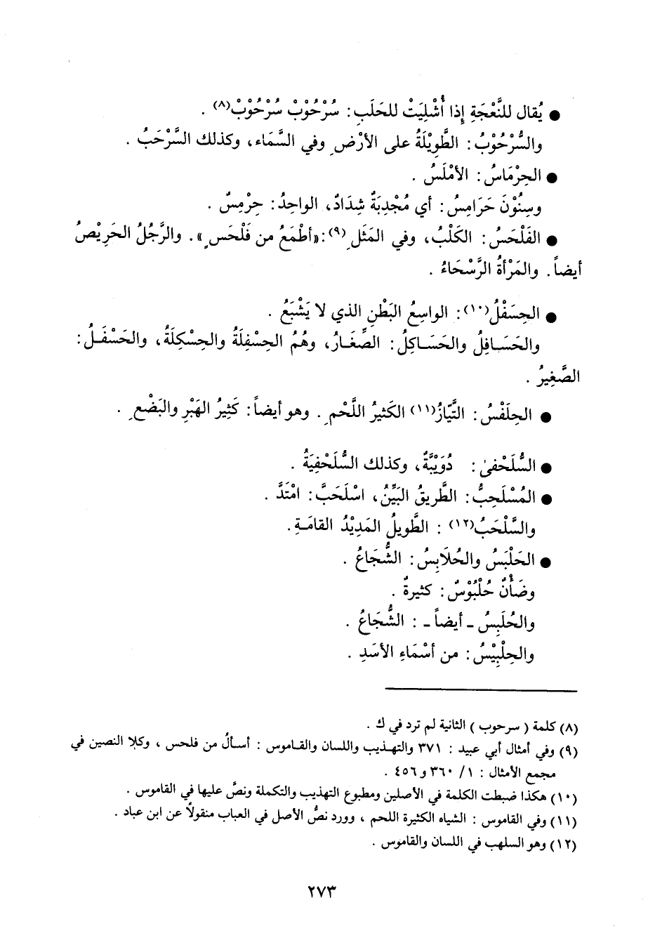 يُقال للنَّعْجَةِ : إذا أُشْلِيَتْ للحَلَبِ : سُرْحُوْبْ سُرْحُوْبْ . والسُّرْحُوْبُ : الطَّوِيْلَةُ على الأرْضِ وفي السَّمَاء ، وكذلك السَّرْحَبُ . الحِرْمَاسُ : الأمْلَسُ . وسِنُوْنَ حَرَامِسُ : أي مُجْدِبَةٌ شِدَادٌ ، الواحِدُ : حِرْمِسٌ . الفَلْحَسُ : الكَلْبُ ، وفي المَثَلِ : ' أطْمَعُ من فَلْحَسِ ' . والرَّجُلُ الحَرِيْصُ أيضاً ، والمَرْأةُ الرَّسْحَاءُ . الحِسَفْلُ : الواسِعُ البَطْنِ الذي لا يَشْبَعُ . والحَسَافِلُوالحَسَاكِلُ : الصِّغَارُ ، وهُمُ الحِسْفِلَةُ والحِسْكِلَةُ ، والحَسْفَلُ : الصَّغِيرُ . الحِلَفْسُ : التَّيّازُ الكَثيرُ اللَّحْمِ ، وهو أيضاً : كَثِيرُ الهَبْرِ والبَضْعِ . السُّلَحْفى : دُوَيْبَّةٌ ، وكذلك السُّلَحْفِيَةُ . المُسْلَحِبُّ : الطَّريقُ البَيِّنُ ، اسْلَحَبَّ : امْتَدَّ . والسَّلْحَبُ : الطَّويلُ المَدِيْدُ القامَةِ . الحَلْبَسُ والحُلاَبِسُ : الشُّجَاعُ . وضَأْنُ حُلْبُوْسٌ : كثيرةٌ . والحُلَبِسُ - أيضاً - : الشُّجَاعُ . والحِلْبِيْسُ : من أسْمَاءِ الأسَدِ .