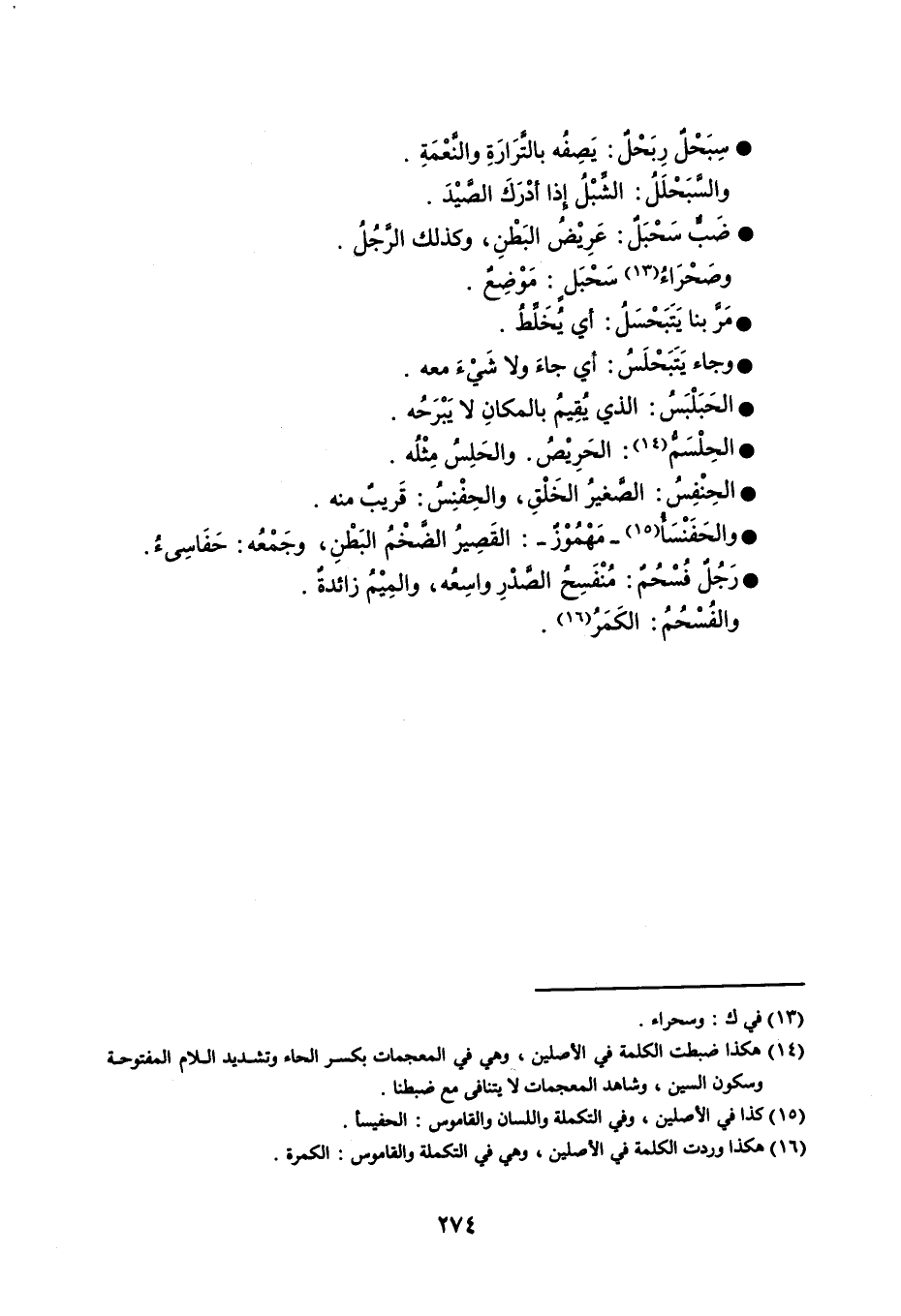سِبَحْلٌ رِبَحْلٌ : يَصِفُه بالتَّرَارَةِ والنَّعْمَةِ . والسَّبَحْلَلُ : الشِّبْلُ إذا أدْرَكَ الصَّيْدَ . ضَبٌّ سَحْبَلٌ : عَرِيْضُ البَطْنِ ، وكذلك الرَّجُلُ . وصَحْرَاءُ سَحْبَلٍ : مَوْضِعٌ . مَرَّ بنا يَتَبَحْسَلُ : أي يُخَلِّطُ . وجاء يَتَبَحْلَسُ : أي جاءَ ولا شَيْءَ معه . الحَبَلْبَسُ : الذي يُقِيُم بالمكانِ لا يَبْرَحُه . الحِلْسَمُّ : الحَرِيْصُ ، والحَلِسُ مِثْلُه . الحِنْفِسُ : الصَّغيرُ الخَلْقِ ، والحِفْنِسُ : قَريبٌ منه . والحَفَنْسَأُ - مَهْمُوْزٌ - : القَصِيرُ الضَّخْمُ البَطْنِ ، وجَمْعُه : حَفَاسِىءُ . رَجُلٌ فُسْحُمٌ : مُنْفَسِحُ الصَّدْرِ واسِعُه ، والمِيْمُ زائدةٌ . والفُسْحُمُ : الكَمَرُ . ؟