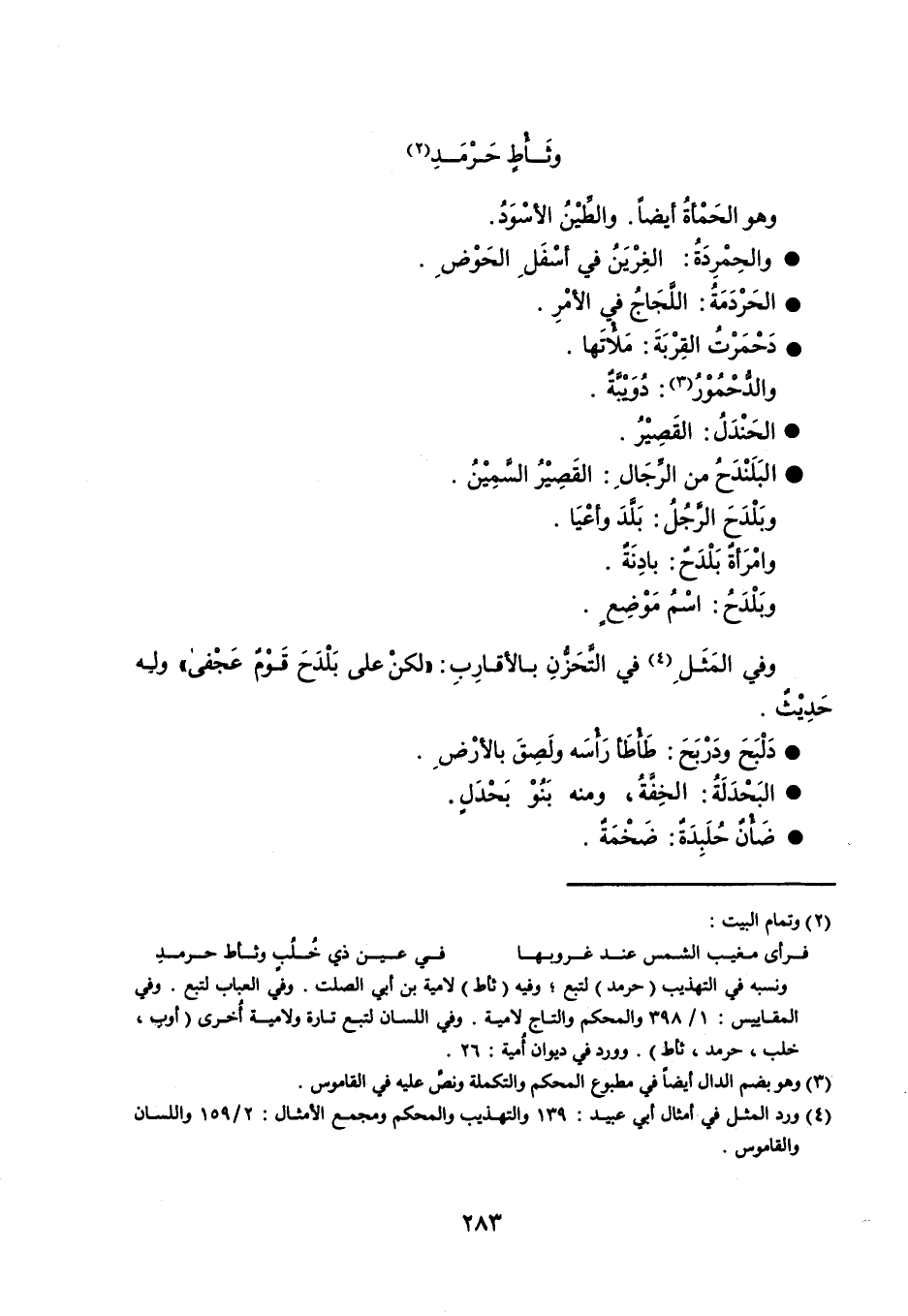 وثَأْطٍ حَرْمَدِ هو الحَمْأةُ أيضاً . والطِّيْنُ الأسْوَدُ . والحِمْرِدَةُ : الغِرْيَنُ في أسْفَلِ الحَوْضِ . الحَرْدَمَةُ : اللَّجَاجُ في الأمْرِ . دَحْمَرْتُ القِرْبَةَ : مَلأُتَها . والدُّحْمُوْرُ : دُوَيْبَّةٌ . الحَنْدَلُ : القَصِيْرُ . البَلَنْدَحُ من الرِّجَالِ : القَصِيْرُ السَّمِيْنُ . وبَلْدَحَ الرَّجُلُ : بَلَّدَ وأعْيَا . وامْرَأةٌ بَلْدَحٌ : بادِنَةٌ . وبَلْدَحُ : اسْمُ مَوْضِعٍ . وفي المَثَلِ في التَّحَزُّنِ بالأقارِبِ : ' لكنْ على بَلْدَحَ قَوْمٌ عَجْفى ' ولبه حَدِيْثٌ . دَلْبَحَ ودَرْبَحَ : طَأْطَأ رَأْسَه ولَصِقَ بالأرْضِ . البَحْدَلَةُ : الخِفَّةُ ، ومنه بَنُوْ بَحْدَلٍ . ضَأْنٌ حُلَبِدَةٌ : ضَخْمَةٌ .