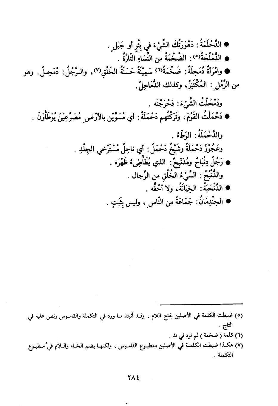 الدَّحْلَمَةُ : دَهْوَرَتُكَ الشَّيْءَ في بِئْرٍ أو جَبَلٍ . الدُّمْلُحَةُ : الضَّخْمَةُ من النِّسَاءِ التّارَّةُ . وامْرَأةٌ دُمَحِلَةٌ : ضَخْمَةٌ سَمِيْنَةٌ حَسَنَةُ الخَلْقِ ، والرَّجُلُ : دُمَحِلٌ . وهو من الرَّمْلِ : المُكْتَنِزُ ، وكذلك الدُّمَاحِلُ . ودَمْحَلْتُ الشَّيْءَ : دَحْرَجْتَه . دَحْمَلْتُ القَوْمَ ، وتَرَكْتُهم دَحْمَلَةً : أي مُسَوَّيْنِ بالأرْضِ مُصَرَّعِيْنَ يُوْطَأُوْنَ . والدَّحْمَلَةُ : الوَطْءُ . وعَجُوْزٌ دَحْمَلَةٌ : أي ناحِلٌ مُسْتَرْخي الجِلْدِ . رَجُلٌ دِنْبَاحٌ ومُدَنْبحٌ : الذي يُطَأْطِئُ ظَهْرَه . والدُّنْبُحُ : السَّيِّءُ الخُلُقِ من الرِّجال . الدَّنْحَبَةُ : الخِيَانَةُ ، ولا أحُقُّه . الحِنْدِمَانُ : جَمَاعَةٌ من النّاسِ ، وليس بِثَبَتٍ .