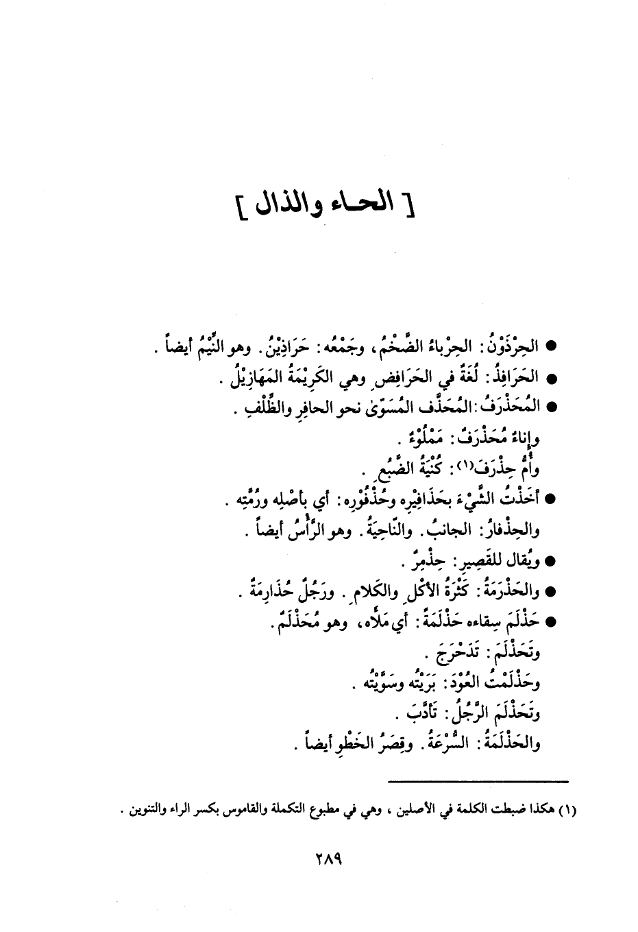 الحِرْذَوْنُ : الحِرْباءُ الضَّخْمُ ، وجَمْعُه : حَرَاذِيْنُ . وهو النِّيْمُ أيضاً . الحَرَافِذُ : لُغَةٌ في الحَرَافِضِ وهي الكَرِيْمَةُ المَهَازِيْلُ . المُحَذْرَفُ : المُحَذَّف المُسَتّوى نحو الحافِرِ والظِّلْفِ . وإناءٌ مُحَذْرَفٌ : مَمْلُوْءٌ . وأُمُّ حِذْرَفَ : كُنْيَةُ الضَّبُعِ . أخَذْتُ الشَّيْءَ بحَذَافِيْرِه وحُذْفُوْرِه : أي بأصْلِه ورُمَّتِه . والحِذْفارُ : الجانبُ . والنّاحِيَةُ . وهو الرَّأْسُ أيضاً . ويُقال للقَصِيرِ : حِذْمِرٌ . والحَذْرَمَةُ : كَثْرَةُ الأكْلِ والكَلامِ . ورَجُلٌ حُذَارِمَةٌ . حَذْلَمَ سِقاءه حَذْلَمَةً : أي مَلأَه ، وهو مُحَذْلَمٌ . وتَحَذْلَمَ : تَدَحْرَجَ . وحَذْلَمْتُ العُوْدَ : بَرَيْتُه وسَوَّيْتُه . وتَحَذْلَمَ الرَّجُلُ : تَأدَّبَ . والحَذْلَمَةُ : السُّرْعَةُ . وقِصَرُ الخَطْوِ أيضاً .