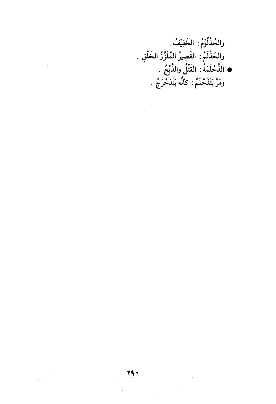 والحُذْلُوْمُ : الخَفِيْفُ . والحَذْلَمُ : القَصِيرُ المُلَزَّزُ الخَلْقِ . الذَّحْلَمَةُ : القَتْلُ والذَّبْحُ . ومَرَّ يَتَذَحْلَمُ : كأنَّه يَتَدَحْرَجُ .