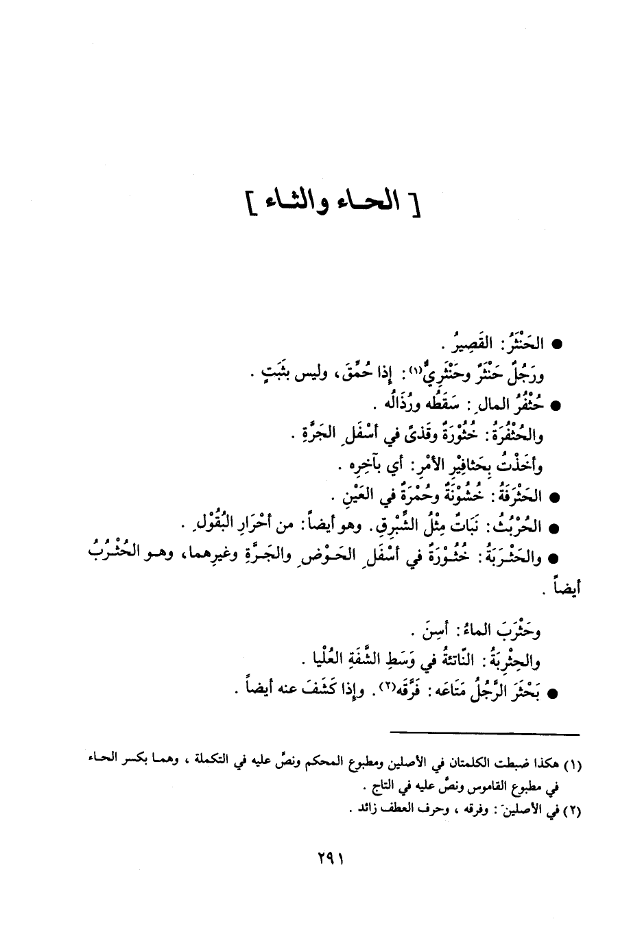 الحَنْثَرُ : القَصِيرُ . ورَجُلٌ حَنْثَرٌ وحَنْثَرِيٌ : إذا حُمِّقَ ، وليس بثَبَتٍ . حُثْفُرُ المالِ : سَقَطُه ورُذَالُه . والحُثْفُرَةُ : خُثُوْرَةٌ وقَذىً في أسْفَلِ الجَرَّةِ . وأخَذْتُ بِحَثافِيْرِ الأمْرِ : أي بآخِرِه . الحَثْرَفَةُ : خُشُوْنَةٌ وحُمْرَةٌ في العَيْنِ . الحُرْبُثُ : نَبَاتٌ مِثْلُ الشِّبْرِقِ . وهو أيضاً : من أحْرَارِ البُقُوْلِ . والحَثْرَبَةُ : خُثُوْرَةٌ في أسْفَلِ الحَوْضِ والجَرَّةِ وغيرِهما ، وهو الحُثْرُبُ وأيضاً . وحَثْرَبَ الماءُ : أسِنَ . والحِثْرِبَةُ : النّاتئةُ في وَسَطِ الشَّفَةِ العُلْيا . بَحْثَرَ الرَّجُلُ مَتَاعَه : فَرَّقَه . وإذا كَشَفَ عنه أيضاً .