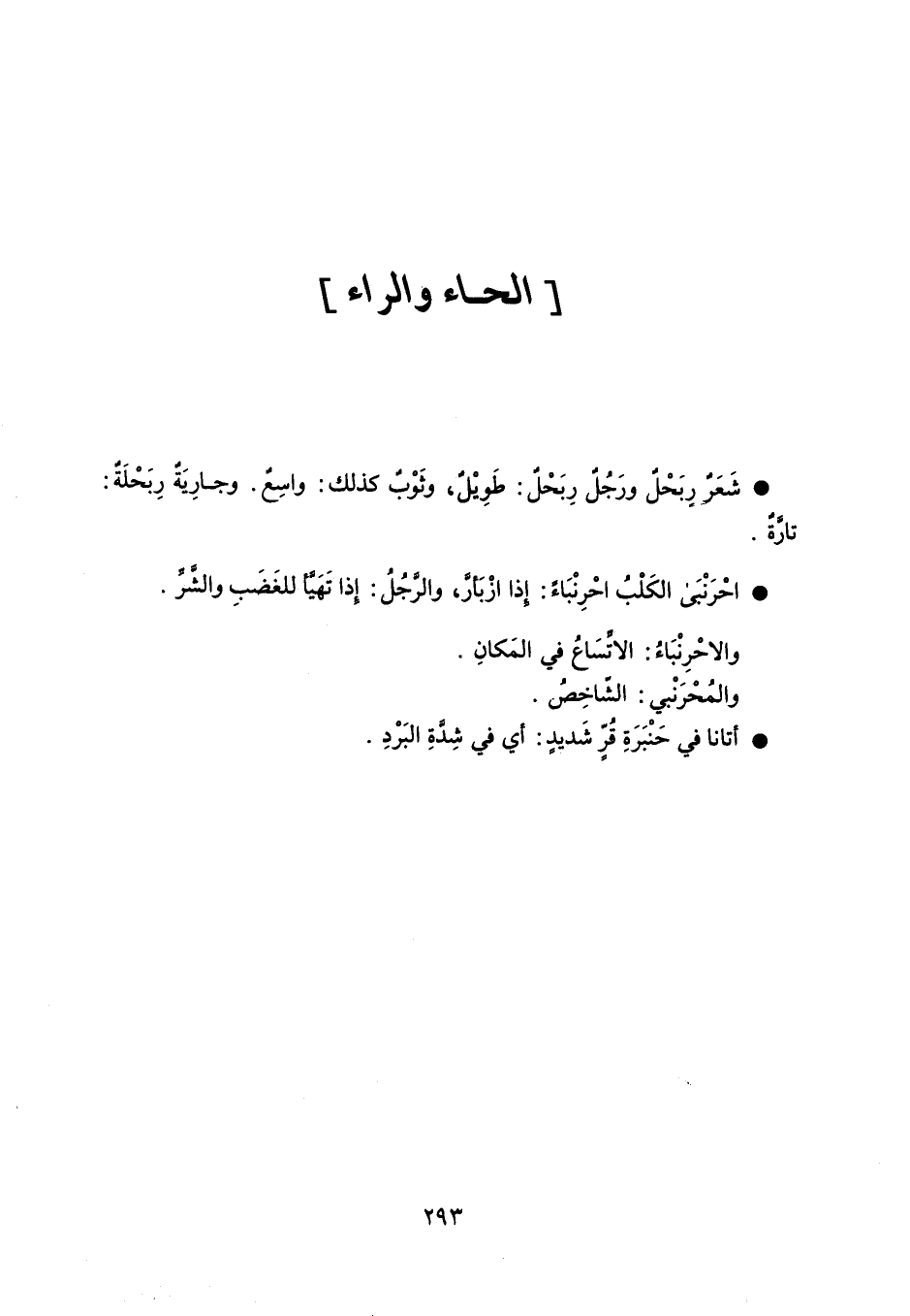 شَعَرٌ رِبَحْلٌ ورَجُلٌ رِبَحْلٌ : طَوِيْلٌ ، وثَوْبٌ كذلك : واسِعٌ ، وجارِيَةٌ رِبَحْلَةٌ : تارَّةً . احْرَنْبَى الكَلْبُ احْرِنْبَاءً : إذا ازْبَأرَّ ، والرَّجُلُ : إذا تَهَيَّأ للغَضَبِ والشَّرِّ . والاحْرِنْبَاءُ : الاتِّسَاعُ في المَكانِ . والمُحْرَنْبى : الشّاخِصُ . أتانا في حَنْبَرَةِ قُرٍّ شَديدٍ : أي في شِدَّةِ البَرْدِ .