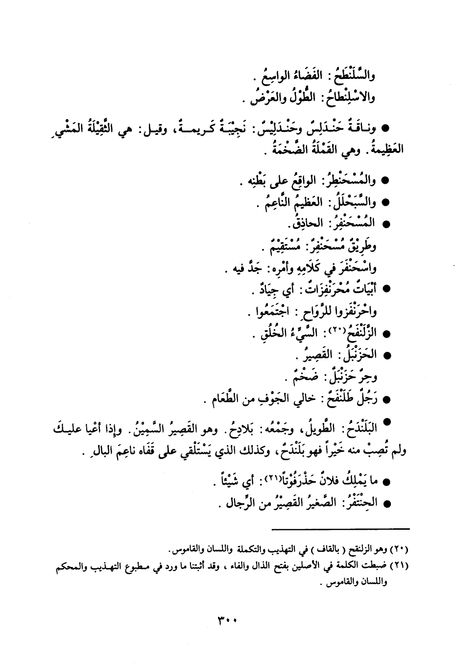 والسَّلْنَطَحُ : الفَضَاءُ الواسِعُ . والاسْلِنْطاحُ : الطُّوْلُ والعَرْضُ . وناقَةٌ حَنْدَلِسٌ وحَنْدَلِيْسٌ : نَجِيْبَةٌ كَريمةٌ ، وقيل : هي الثَّقِيْلَةُ المَشْيِ العَظِيمةُ . وهي القَمْلَةُ الضَّخْمَةُ . والمُسْحَنْطِرُ : الواقِعُ على بَطْنِه . والسَّبَحْلَلُ : العَظيمُ النَّاعِمُ . المُسْحَنْفِرُ : الحاذِقُ . وطَرِيْقٌ مُسْحَنْفِرٌ : مُسْتَقِيْمٌ . واسْحَنْفَرَ في كَلاَمِهِ وأمْرِه : جَدَّ فيه . أبْيَاتٌ مُحْرَنْفِزَاتٌ : أي جِيَادٌ . واحْرَنْفَزوا للرَّوَاح : اجْتَمَعُوا . الزَّلَنْفَحُ : السَّيِّءُ الخُلُقِ . الحَزَنْبَلُ : القَصِيرُ . وجِرٌ حَزَنْبَلٌ : ضَخْمٌ . رَجُلٌ طَلَنْفَحٌ : خالي الجَوْفِ من الطَّعَام . البَلَنْدَحُ : الطَّويلُ ، وجَمْعُه : بَلادِحُ ، وهو القَصِيرُ السَّمِيْنُ ، وإِذا أعْيا عليكَ ولم تُصِبْ منه خَيْراً فهو بَلَنْدَحٌ ، وكذلك الذي يَسْتَلْقي على قَفَاه ناعِمَ البالِ . ما يَمْلِكُ فلانٌ حَذْرَفُوْتاً : أي شَيْئاً . الحِنْتَفْرُ : الصَّغيرُ القَصِيْرُ من الرِّجال .