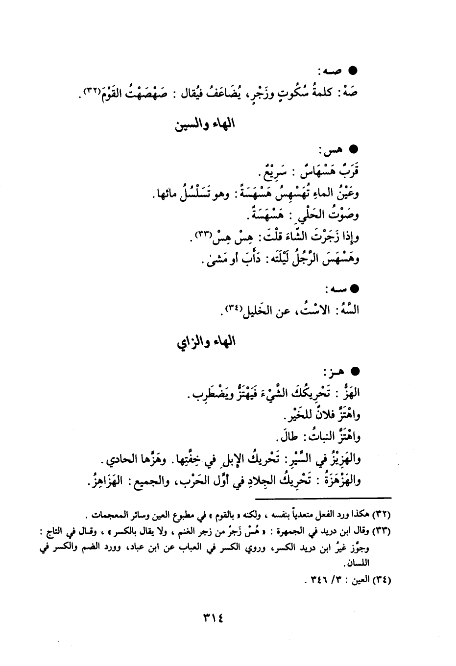 هس قَرَبٌ هَسْهَاسٌ : سَرِيْعٌ . وعَيْنُ الماءِ تُهَسْهِسُ هَسْهَسَةً : وهو تَسَلْسُلُ مائها . وصَوْتُ الحَلْيِ : هَسْهَسَةٌ . وإذا زَجَرْتَ الشّاءَ قْلَت : هِسْ هِسْ . وهَسْهَسَ الرَّجُلُ لَيْلَتَه : دَأَبَ أو مَشي . سه السَّهُ : الاسْتُ ، عن الخَليل .