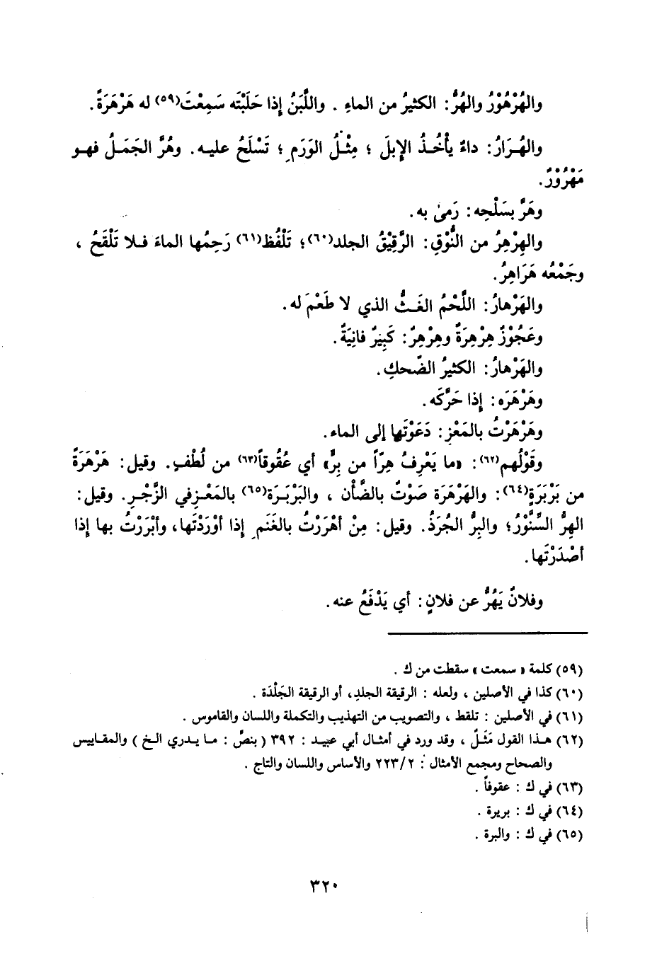 والهُرْهُوْرُ والهُرُّ : الكثيرُ من الماءِ . واللَّبَنُ إذا حَلَبْتَه سَمِعْتَ له هَرْهَرَةً . والهُرَارُ : داءٌ يأْخُذُ الإبلَ ، مِثْلُ الوَرَمِ ، تَسْلَحُ عليه . وهُرَّ الجَمَلُ فهو مَهْرُوْرٌ . وهَرَّ بسَلْحِه : رَمى به . والهِرْهِرُ من النُّوْقِ : الرَّقِيْقُ الجلد ، تَلْفُظ رَحِمُها الماءَ فلا تَلْقَحُ ، وجَمْعُه هَرَاهِرُ . والهَرْهارُ : اللَّحْمُ الغَثُّ الذي لا طَعْمَ له . وعَجُوْزٌ هِرْهِرَةٌ وهِرْهِرٌ : كَبِيرٌ فانِيَةٌ . والهَرْهارُ : الكثيرُ الضّحكِ . وهَرْهَرَه : إذا حَرَّكَه . وهَرْهَرْتُ بالمَعْزِ : دَعَوْتَها إلى الماء . وقولهم : ما يَعْرِفُ هِرّاً من بِرٍّ أي عُقُوقاً من لُطْفٍ ، وقيل : هَرْهَرَةً من بَرْبَرَةً : والهَرْهَرَة صَوْتٌ بالضَّأْن ، والبَرْبَرَة بالمَعْزِفي في الزَّجْرِ . وقيل : الهِرُّ السِّنَّوْرُ ، والبِرُّ الجُرَذُ . وقيل : مِنْ أهْرَرْتُ بالغَنَمِ إذا أوْرَدْتَها ، وأبْرَرْتُ بها إذا أصْدَرْتَها . وفلانٌ يَهُرُّ عن فلانٍ : أي يَدْفَعُ عنه .