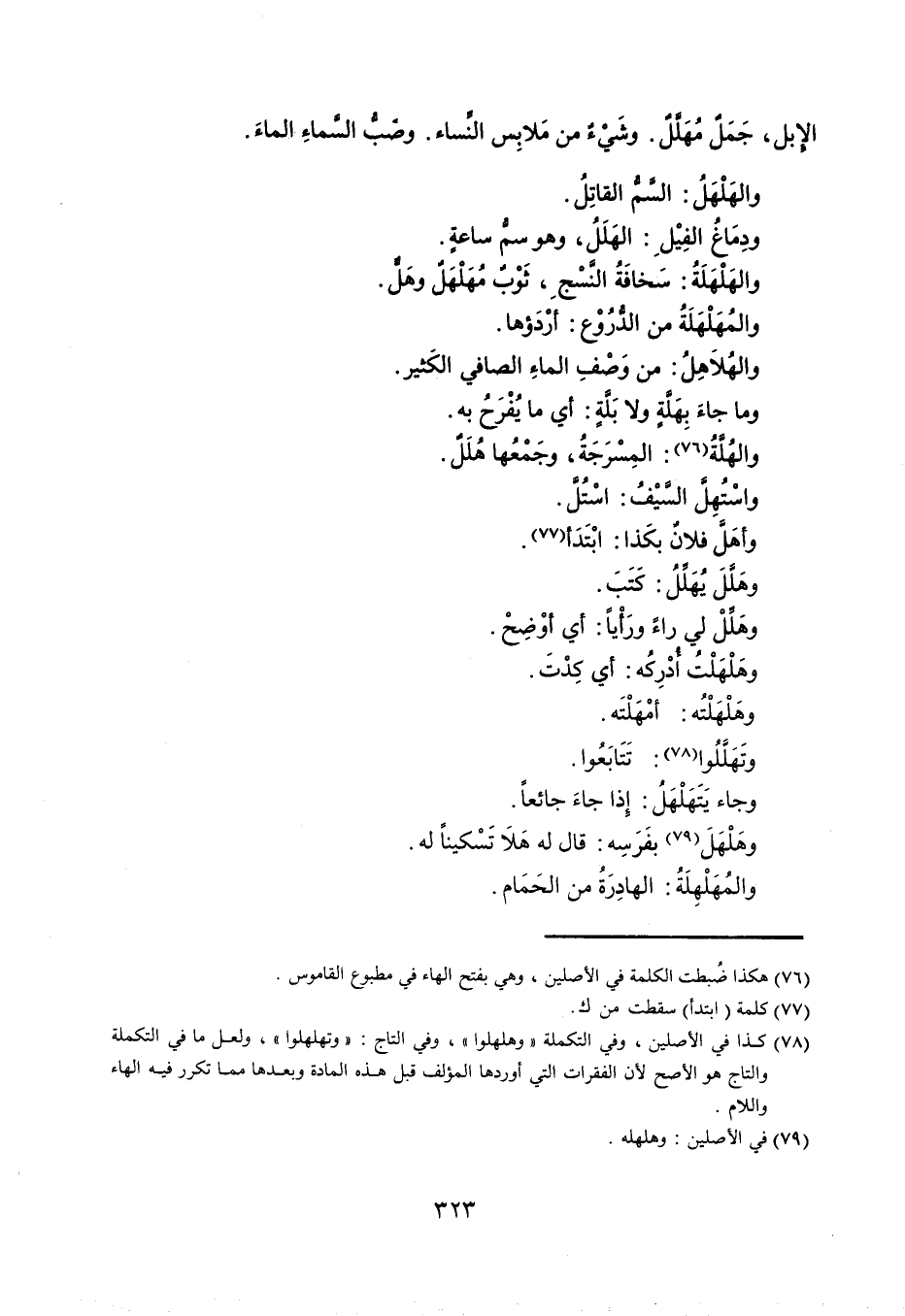 الإبل ، جَمَلٌ مُهَلَّلٌ ، وشَيْءٌ من مَلابِس النِّساء ، وصَبُّ السَّماءِ الماءَ . والهَلْهَلُ : السَّمُّ القاتِلُ . ودِمَاغُ الفِيْلِ : الهَلَلُ ، وهم سمُّ ساعةٍ . والهَلْهَلَةُ : سَخافَةُ النَّسْجِ ، ثَوْبٌ مُهَلْهَلٌ وهَلٌ . والمُهَلْهْلَةُ من الدُّرُوْع : أرْدَؤها . والهُلاَهِلُ : من وَصْفِ الماءِ الصافي الكَثير وما جاءَ بِهَلَّةٍ ولا بِلَّةٍ : أي ما يُفْرَحُ به . والهُلَّةُ : المِسْرَجَةُ ، وجَمْعُها هُلَلٌ . واسْتُهِلَّ السَّيْفُ : اسْتُلَّ . وأهَلَّ فلانٌ بكَذا : ابْتَدَأ . وهَلَّلَ يُهَلِّلُ : كَتَبَ . وهَلِّلْ لي راءً ورَأْياً : أي أوْضِحْ . وهَلْهَلْتُ أُدْرِكُه : أي كِدْتَ . وهَلْهَلْتُه : أمْهَلْتَه . وتَهَلَّلُوا : تَتَابَعُوا . وجاء يَتَهَلْهَلُ : إذا جاءَ جائعاً . وهَلْهَلَ بفَرَسِه : قال له هَلاَ تَسْكيناً له . والمُهَلْهِلَةُ : الهادِرَةُ من الحَمَام .