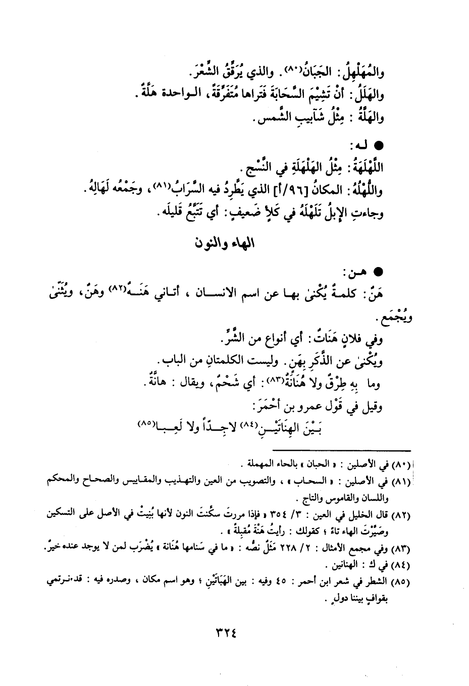 . هن هَنٌ : كلمةٌ يُكْنى بها عن اسم الانسان ، أتاني هَنَةٌ وهَنٌ ، ويُثَنّى ويُجْمَع . وفي فلانٍ هَنَاتٌ : أي أنواع من الشَّرِّ . ويُكْنى عن الذَّكَرِ بِهَن ، وليست الكلمتانِ من الباب . وما بِهِ طِرْقٌ ولا هُنَانَةٌ : أي شَحْمٌ ، ويقال : هانَّةٌ . وقيل في قَوْل عمرو بن أحمر : بَيْنَ الهِنَاتَيْنِ لاجِدّاً ولا لَعِباً