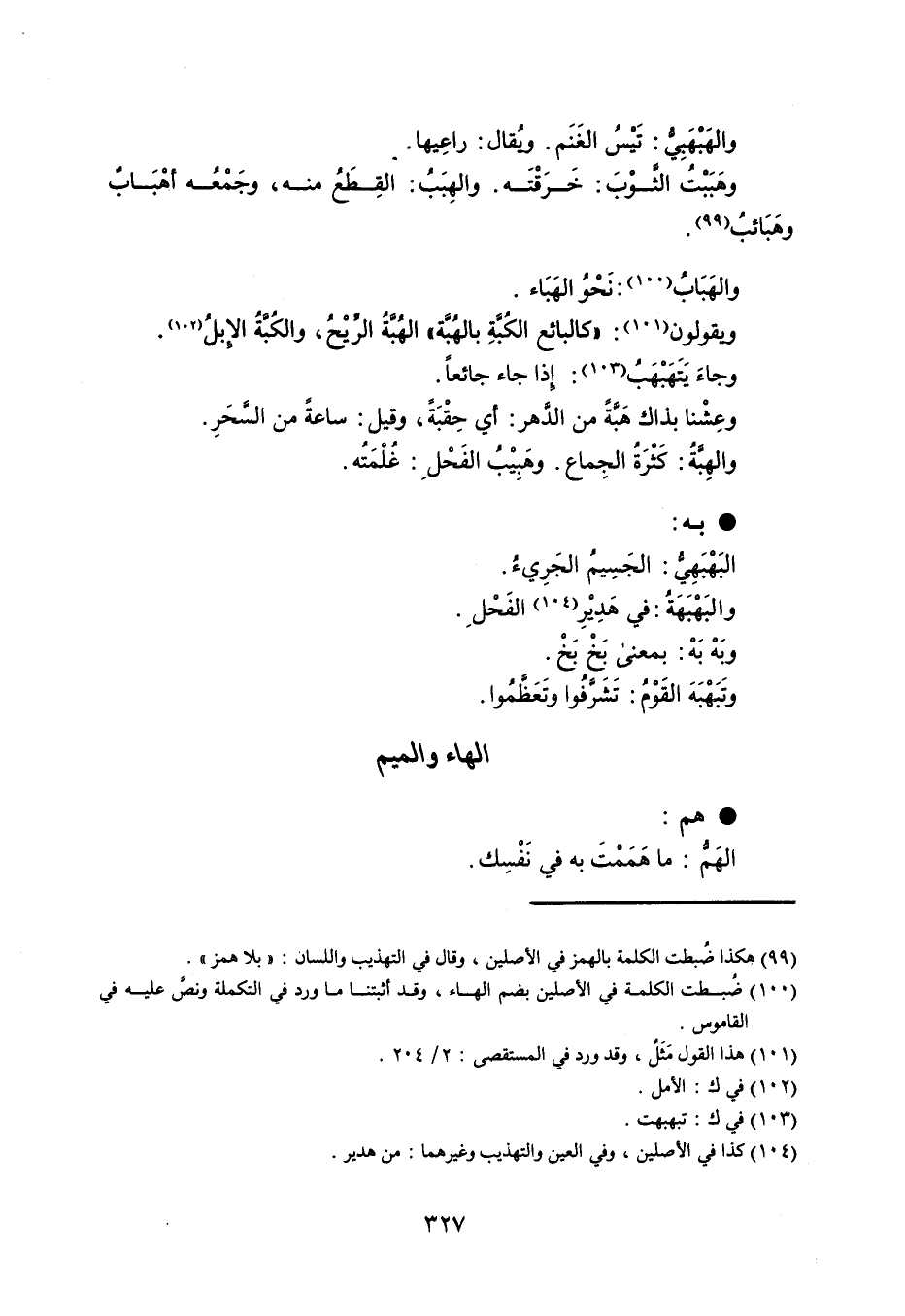 والهَبْهَبِيُّ : تَيْسُ الغَنَم . ويُقال : راعِيها . وهَبَبْتُ الثَّوْبَ : خَرَقْتَه ، والهِبَبُ : القِطَعُ منه ، وجَمْعُه أهْبَابٌ وهَبَائبُ . والهَبَابُ : نَحْوُ الهَبَاء . ويقولون : كالبائع الكُبَّةِ بالهُبَّة . الهُبَّةُ الرِّيْحُ ، والكُبَّةُ الإبلُ . وجاءَ يَتَهَبْهَبُ : إذا جاء جائعاً . وعِشْنا بذاك هَبَّةً من الدَّهر : أي حِقْبَةً ، وقيل : ساعةً من السَّحَرِ . والهِبَّةُ : كَثْرَةُ الجِماع ، وهَبِيْبُ الفَحْلِ : غُلْمَتُه . به البَهْبَهِيُّ : الجَسِيمُ الجَرِيءُ . والبَهْبَهَةُ : في هَدِيْرِ الفَحْلِ . وبَهْ بَهْ : بمعنى بَخْ بَخْ . وتَبَهْبَهَ القَوْمُ : تَشَرَّفُوا وتَعَظَّمُوا .