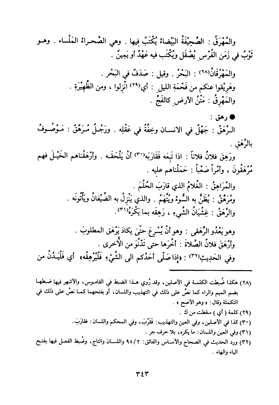 والمُهْرَقُ : الصَّحِيْفَةُ البَيْضاءُ يُكْتَبُ فيها . وهي الصَّحراءُ المَلْساء . وهو ثَوْبٌ في زَمَن الفُرْسِ يُصْقَل ويُكْتَب فيه عَهْدٌ أو يَمِينٌ . والمَهْرُقَانُ : البَحْرُ . وقيل : صَدَفٌ في البَحْر . وهَرِيْقوا عنكم من فَحْمَةِ الليلِ : أي انْزِلوا ، ومن الظَّهِيْرَةِ . والمَهْرِقُ : مَتْنُ الأرضِ كالفَجِّ . رهق الرَّهَقُ : جَهْلٌ في الإنسان وخِفَّةٌ في عَقْلِه . ورَجُلٌ مُرَهَّقٌ : مَوْصُوفٌ بالرَّهَقِ . ورَهِقَ فلانٌ فلاناً : إذا تَبِعَه فَقَارَبَه أنْ يَلْحَقَه . وأرْهَقْناهم الخَيْلَ فهم مُرْهَقُونَ ، وأمْراً صَعْباً : حَمَلْناهم عليه . والمُرَاهِقُ : الغُلامُ الذي قارَبَ الحُلُمَ . ومُرَهَّقٌ : يُظَنُّ به السُّوءُ ويُتَّهَمُ والذي يَنْزِلُ به الضِّيْفانُ ويَأتُونُه . والرَّهَقُ : غِشْيَانُ الشَّيءِ . رَهِقَه بما يَكْرَهُ . وهو يَعْدُو الرَّهَقى : وهو أنْ يُسْرِعَ حتّى يكادَ يَرْهَق المطلوبَ . وأرْهَقَ فلانٌ الصَّلاةَ : أخَّرَها حتى تَدْنُوَا ، الأُخرى . وفي الحَدِيثِ : ' إذا صَلّى أحَدُكم إلى الشَّيْءِ فَلْيُرْهِقْه أي فَلْيَدْنُ من