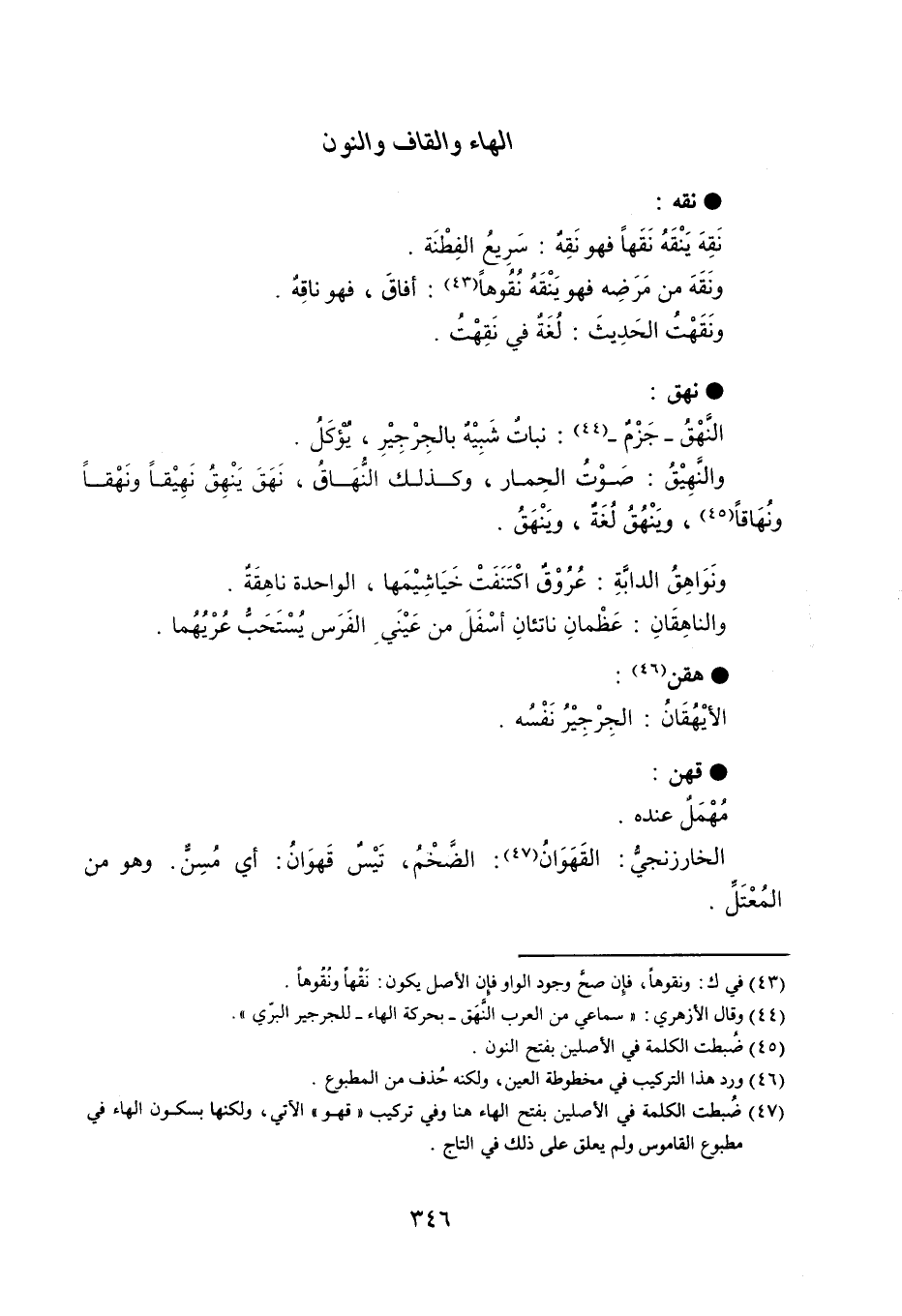 نقه نَقِهَ يَنْقَهُ نَقَهاً فهو نَقِهٌ : سَرِيعُ الفِطْنَة . ونَقَهَ من مَرَضِه فهو يَنْقَهُ نُقُوهاً : أفاقَ ، فهو ناقِهٌ . ونَقَهْتُ الحَدِيثَ : لُغَةٌ في نَقِهْتُ . نهق النَّهْقُ - جَزْمٌ - : نباتٌ شَبِيْهٌ بالجِرْجِيْرِ ، يُؤْكَلُ . والنَّهِبْقُ : صَوْتُ الحِمار ، وكذلك النُّهَاقُ ، نَهَقَ يَنْهِقُ نَهِيْقاً ونَهْقاً ونُهَاقاً ، ويَنْهُقُ لُغَةٌ ، ويَنْهَقُ . ونَوَاهِقُ الدابَّةِ : عُرُوْقٌ اكْنَتَفَتْ خَيَاشِيْمَها ، الواحدة ناهِقَةٌ . والناهِقَانِ : عَظْمانِ ناتئانِ أسْفَلَ من عَيْنَيِ الفَرَس يُسْتَحَبُّ عُرْيُهُما . هقن الأيْهُقَانُ : الجِرْجِيْرُ نَفْسُه . قهن مُهْمَلٌ عنده . الخارزنجي : القَهَوَانُ : الضَّخْمُ : تَيْسٌ قَهوَانُ أي مُسِنٌّ . وهو من المُعْتَلِّ .