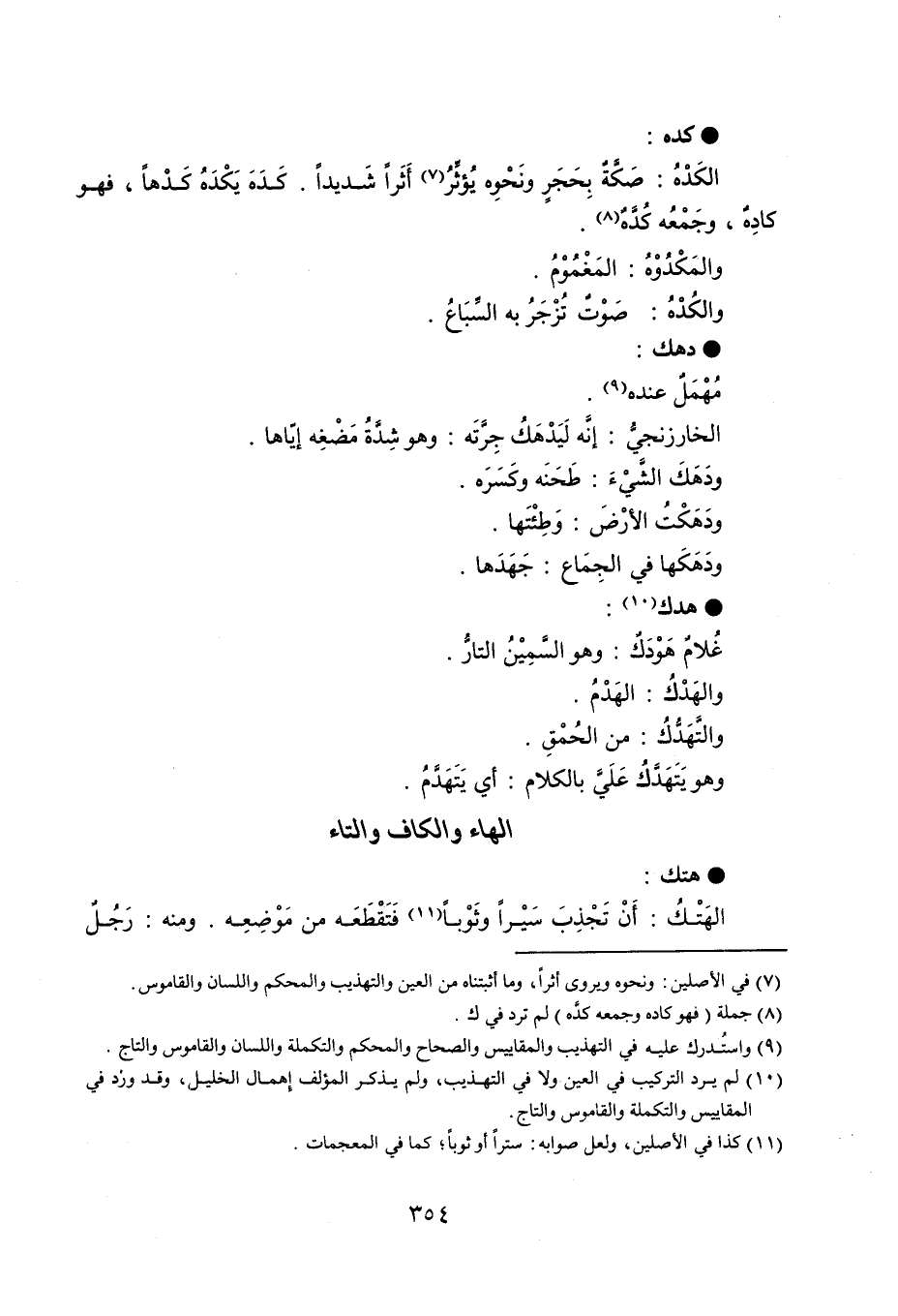 كده الكَدْةُ : صَكَّةُ بِحَجَرٍ ونَحْوِه يُؤثِّرُ أَثَراً شَديدأً ، كَدَهَ يَكْدَهُ كَدْهاً ، فهو كادِهٌ ، وجَمْعُه كُدَّهٌ . والمَكْدُوْهُ : المَغْمُوْمُ . والكُدْهُ : صَوْتٌ تُزْجَرُ به السِّبَاعُ . دهك مُهْمَلٌ عنده . الخارزنجي : إنَّه لَيَدْهَكُ جِرَّتَه : وهو شِدَّةُ مَضْغِه إيّاها . ودَهَكَ الشَّيْءَ : طَحَنَه وكَسَرَه . ودَهَكَتُ الأرْضَ : وَطْئْتَها . ودَهَكَها في الجِمَاع : جَهَدَها . هدك غُلامٌ هَوْدَكٌ : وهو السَّمِيْنُ التارُّ . والهَدْكُ : الهَدْمُ . والتَّهَدُّكُ : من الحُمْقِ . وهو يَتَهَدَّكُ عَلَيَّ بالكلام : أي يَتَهَدَّمُ .