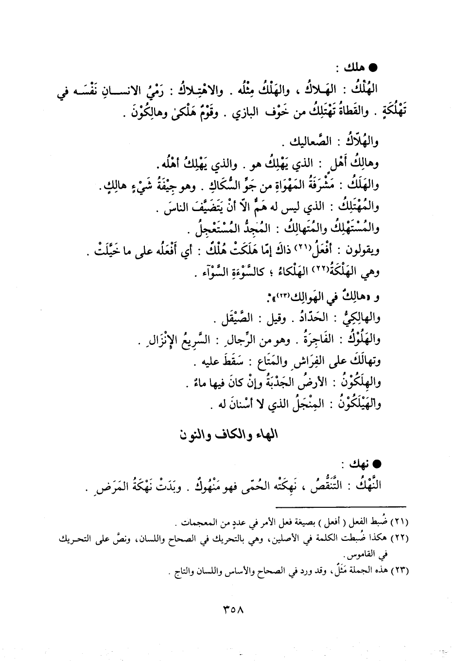 هلك الهُلْكُ : الهَلاكُ ، والهَلْكُ مِثْلُه ، والاهْتِلاكُ : رَمْيُ الإنسان نَفْسَه في تَهْلُكَةٍ . والقَطاةُ تَهْتَلِكُ من خَوْف البازي ، وقَوْمٌ هَلْكى وهالِكُوْنَ . والهُلاّكُ : الصَّعاليك . وهالِكُ أَهْلٍ : الذي يَهْلِكُ هو . والذي يَهْلِكُ أهْلُه . والهَلَكُ : مَشْرَفَةٌ المَهْوَاةِ من جَوِّ السُّكَاكِ ، وهو جِيْفَةُ شَيْءٍ هالِكٍ . والمُهْتَلِكُ : الذي ليس له هَمٌّ إلاّ أنْ يَتَضَيَّفَ الناسَ . والمُسْتَهِلكُ والمُتَهالِكُ : المُجِدُّ المُسْتَعْجِلُ . ويقولون : أفْعَلُ ذاكَ إمّا هَلَكَتْ هُلْكٌ : أي أَفْعَلُه على ما خَيَّلَتْ . وهي الهَلْكَةُ الهَلْكاءُ ، كالسَّوْءَةِ السَّوْآء . وهالِكٌ في الهَوالِك . والهالِكِيُّ : الحَدّادُ ، وقيل : الصَّقْيَل . والهَلُوْكُ : الفَاجِرَةُ ، وهو من الرِّجالِ : السَّرِيعُ الإنْزَالِ . وتهالَكَ على الفِرَاشِ والمَتَاع : سَقَطَ عليه . والهِلَكُوْنُ : الأرضُ الجَدْبَةُ وإنْ كانَ فيها ماءٌ . والهَيْلَكُوْنُ : المِنْجَلُ الذي لا أسْنانَ له .