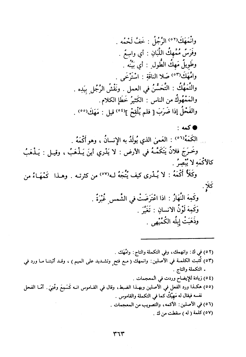 وانْمَهَكَ الرَّجُلُ : خَفَّ لَحْمُه . وفَرَسٌ مُمَّهِكُ اللَّبَانِ : أي واسِعٌ . وطَوِيلٌ مَهِكُ الطُّولِ : أي بَيِّنُه . وامَّهَكَ صَلا الناقَةِ : اسْتَرْخَى . والتَّمَهُّكُ : التَّحَسُّنُ في العمل ، ونَقْشُ الرَّجُلِ بِيَدِه . والمَمْهُوكُ من الناس : الكَثيرُ خَطَإ الكلام . والفَحْلُ إذا ضَرَبَ فلم يُلْقِحْ قيل : مَهَكَ . كمه الكَمَهُ : العَمى الذي يُولَدُ به الإنسانُ ، وهو أَكْمَهُ . وخَرَجَ فلانٌ يَتَكَمَّهُ في الأرض : لا يَدْري أينَ يَذْهَبُ ، وقيل : يَذْهَبُ كالأكْمَهِ لا يُبْصِرُ . وكَلَأْ أَكْمَهُ : لا يُدْرى كيف يُتَّجَهُ له من كثرته ، وهذا كَمْهَاءُ ، كَلإَ . وكَمِهَ النَّهَارُ : إذا اعْتَرَضَتْ في الشَّمسِ غُبْرَة . وَكَمِهَ لَوْنُ الانسانِ : تَغَيَّرَ . وذَهَبَتْ إبِلُه الكُمَّيْهى .