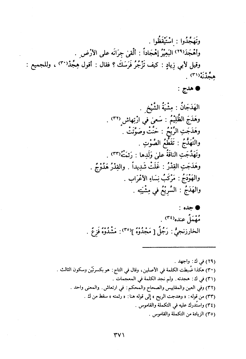وتَهَجَّدُوا : اسْتَيْقَظُوا . وأهْجَدَ البَعِيْرُ إهْجَاداً : ألقْى جِرَانَهَ على الأرْضِ . وقيل لأبي زيادٍ : كيف تَزْجُرُ فَرَسَكَ ؟ فقال : أقول هِجِّدْ ، وللجميع : هِجِّدْنَهْ . هدج الهَدَجَانُ : مِشْيَةُ الشَّيْخِ . وهَدَجَ الظَّلِيْمُ : سَعى في ارْتِهاشٍ . وهَدَجَتِ الرِّيْحُ : حَنَّتْ وصَوَّتَتْ . والتَّهَدُّجُ : تَقَطُّعُ الصَّوْتِ . وتَهَدَّجَتِ الناقَةُ على وَلَدِها : رَئمَتْهُ . وهَدَجَتِ القِدْرُ : غَلَتْ شَدِيداً . والقِدْرُ هَدُوْجٌ . والهَوْدَجُ : مَرْكَبُ نِسَاءِ الأعْرَاب . والهَدَجُ : السَّرِيْعُ في مِشْيَتِه . جده مُهْمَلٌ عنده . الخارزنجي : رَجُلٌ مَجْدُوْهٌ : مَشْدُوْهٌ فَزِعٌ .