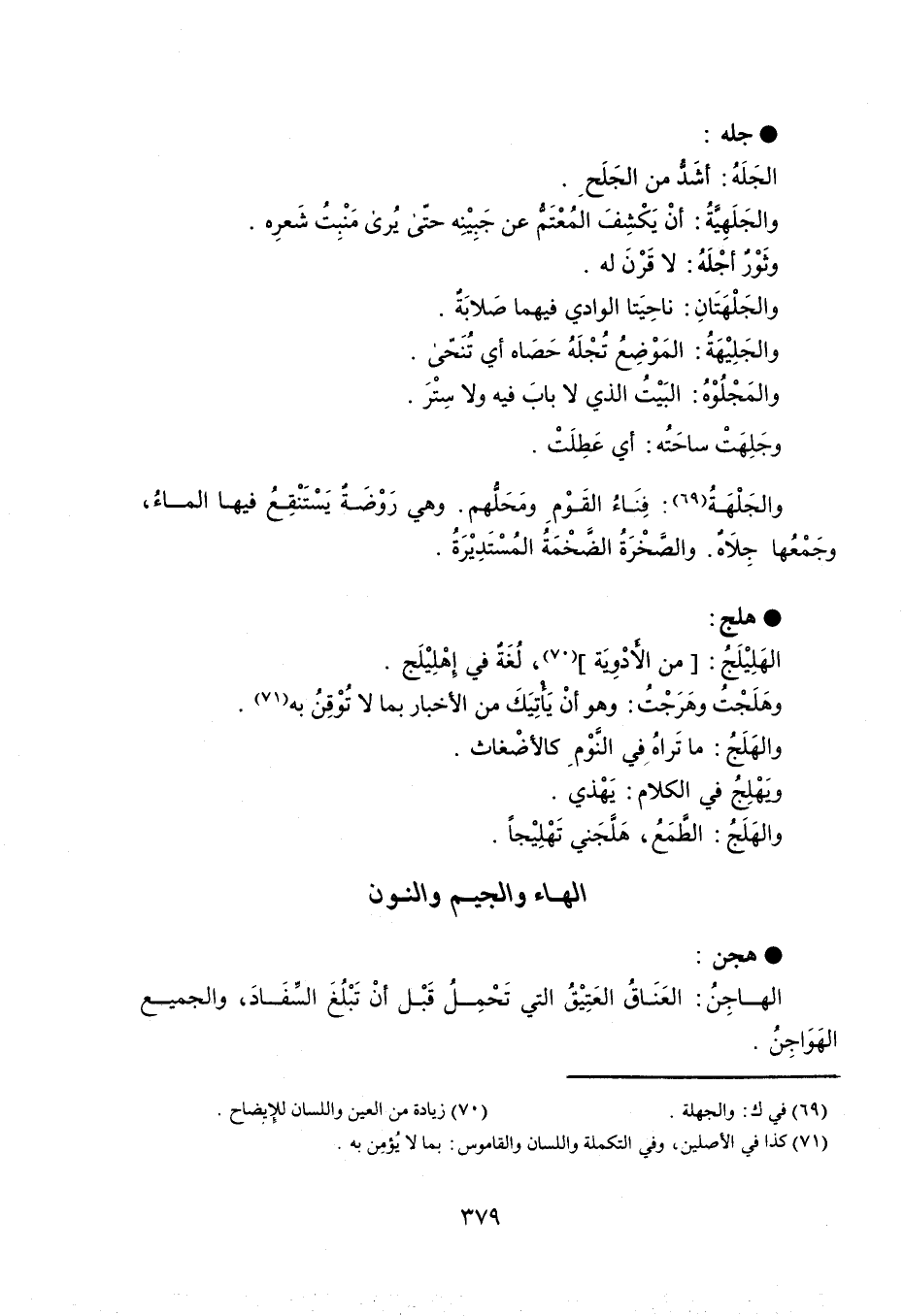 جله الجَلَهُ : أشَدُّ من الجَلَحِ . والجَلَهِيَّةُ : أنْ يَكْشِفَ المُعْتَمُّ عن جَبِيْنِه حتّى يُرى مَنْبِتُ شَعرِه . وثَوْرٌ أجْلَهُ : لا قَرْنَ له . والجَلَهَتَانِ : ناحِيَتا الوادي فيهما صَلابَةٌ . والجَلِيْهَةٌ : المَوْضِعُ تُجْلَهُ حَصَاه أي تُنَحّى . والمَجْلُوْهُ : البَيْتُ الذي لا بابَ فيه ولا سِتْرَ . وجَلِهَتْ ساحَتُه : أي عَطِلَتْ . والجَلْهَةُ : فِنَاءُ القَوْمِ ومَحَلُّهم ، وهي رَوْضَةٌ يَسْتَنْقِعُ فيها الماءُ ، وجَمْعُها جِلاَهٌ . والصَّخْرَةُ الضَّخْمَةُ المُسْتَدِيْرَةُ . هلج الهَلِيْلَجُ : من الأَدْوِيَة ، لُغَةٌ في إهْلِيْلَج . وهَلَجْتُ وهَرَجْتُ : وهو أنْ يَأْتِيَكَ من الأخبار بما لا تُوْقِنُ به . والهَلَجُ : ما تَراهُ في النَّوْمِ كالأضْغاث . ويَهْلِجُ في الكلام : يَهْذي . والهَلَجُ : الطَّمَعُ ، هَلَّجَني تَهْلِيْجاً .