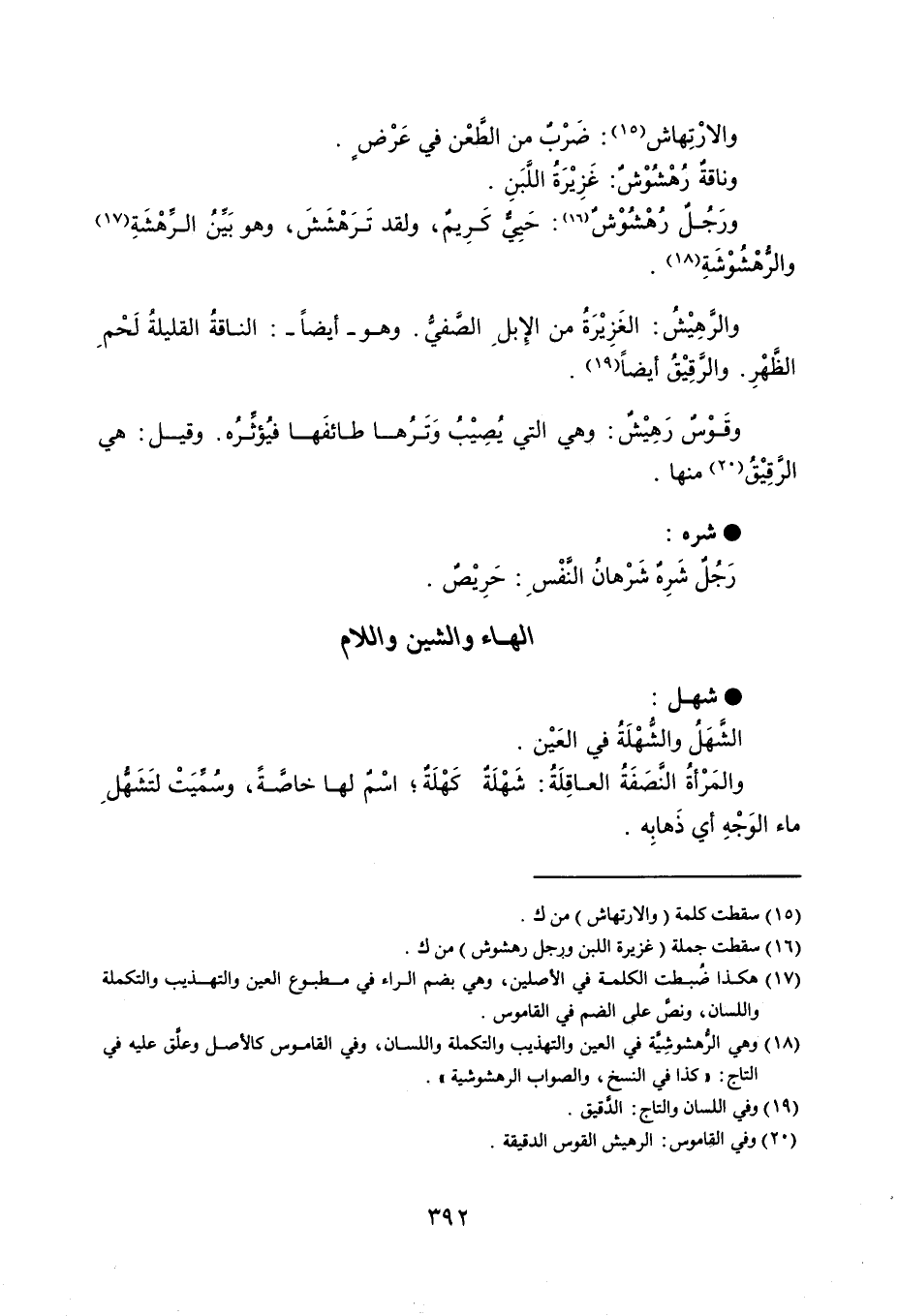 والارْتِهاش : ضَرْبٌ من الطَّعْن في عَرْضٍ . وناقةٌ رُهْشُوْشٌ : غَزِيْرَةُ اللَّبَنِ . ورَجُلٌ رُهْشُوْشٌ : حَيِيٌّ كَرِيمٌ ، ولقد تَرَهْشَشَ ، وهو بَيِّنُ الرِّهْشَةِ والرُّهْشُوْشَةِ . والرَّهِيْشُ : الغَزِيْرَةُ من الإبلِ الصَّفيُّ . وهو أيضاً - الناقةُ القليلةُ لَحْمِ الظَّهْرِ . والرَّقِيْقُ أيضاً . وقَوْسٌ رَهِيْشٌ : وهي التي يُصِيْبُ وَتَرُها طائفَها فيُؤثِّرُه ، وقيل : هي الرَّقِيْقُ منها . شره رَجُلٌ شَرِهٌ شَرْهانُ النَّفْسِ : حَرِيْصٌ .