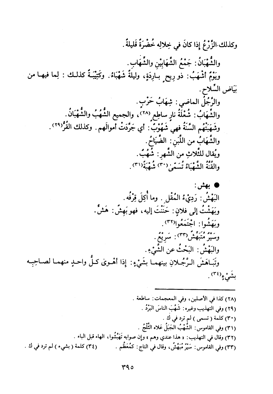 وكذلك الزَّرْعُ إذا كانَ في خِلالِه خُضْرَةٌ قَليلةٌ . والشُّهْبَانُ : جَمْعُ الشًّهَابِيْنِ والشِّهَابِ . ويَوْمٌ أشْهَبُ : ذو رِيحٍ بارِدَةٍ وليلةٌ شَهْبَاءُ ، وكَتِيْبَةٌ كذلك : لِما فيها من بَيَاض السَّلاح . والرَّجُلُ الماضي : شِهَابُ حَرْبٍ . والشِّهَابُ : شُعْلَةُ نارٍ ساطِعٍ ، والجميع الشُّهُبُ والشُّهْبَانُ . وشَهَبَتْهُم السَّنَةُ فهي شَهُوْبٌ : أي جَرَّدَتْ أموالَهم ، وكذلك القُرُّ . والشَّهَابُ من اللَّبَنِ : الضَّيَاحُ . ويُقال للثَّلاثِ من الشَّهرِ : شُهُبٌ . والقُنَّةُ الشَّهْبَاءُ تُسَمّى : شُهْبَةً . بهش البَهْشُ : رَدِيْءُ المُقْلِ . وما أُكِلَ قِرْفُه . وبَهَشْتُ إلى فلانٍ : حَنَنْتَ إليه ، فهو بَهِشٌ : هَشٌّ . وبَهَشُوا : اجْتَمَعُوا . وسَيْرٌ مُتَبَهِّشٌ : سَرِيْعٌ . والبَهْشُ : البَحْثُ عن الشَّيْءِ . وتَبَاهَشَ الرَّجُلانِ بينهما بشَيْءٍ : إذا أهْوى كلُّ واحدٍ منهما لصاحِبِه بشَيْءٍ .