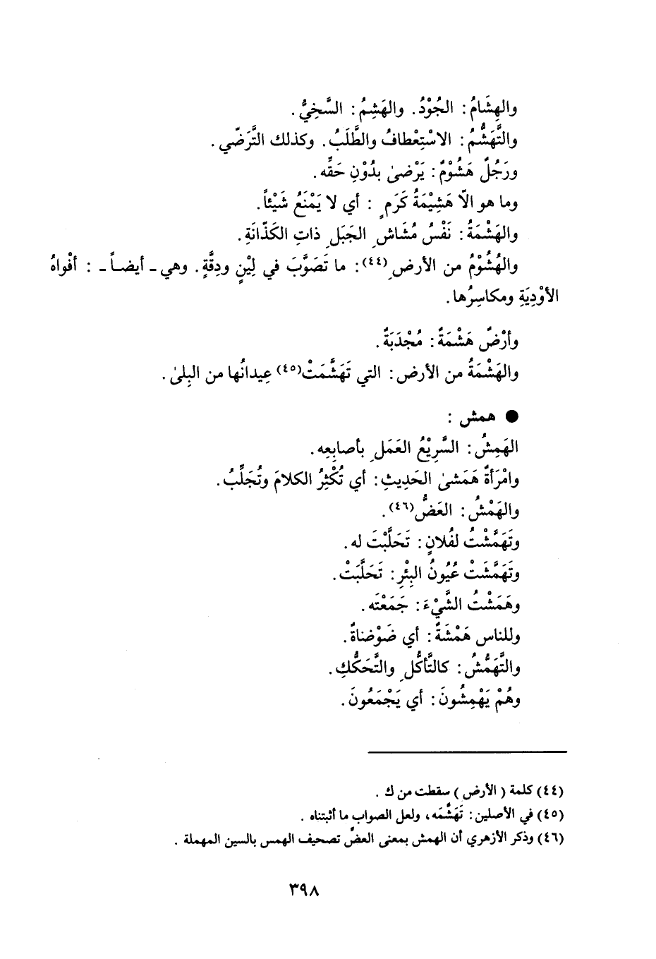 والهِشَامُ : الجُوْدُ . والهَشِمُ : السَّخِيُّ . والتَّهَشُّمُ : الاسْتِعْطافُ والطَّلَبُ ، وكذلك التَّرَضّي . ورَجُلٌ هَشُوْمٌ : يَرْضى بدُوْنِ حَقِّه . وما هو إلاّ هَشِيْمَةُ كَرَمٍ : أي لا يَمْنَعُ شَيْئاً . والهَشْمَةُ : نَفْسُ مُشَاشِ الجَبَلِ ذاتِ الكَذّانَةِ . والهُشُوْمُ من الأرضِ : ما تَصَوَّبَ في لِيْنٍ ودِقَّةٍ . وهي - أيضاً - أفْواهُ الأوْدِيَةِ ومكاسِرُها . وأرْضٌ هَشْمَةٌ : مُجْدَبَةٌ . والهَشَمَةُ من الأرض : التي تَهَشَّمَتْ عِيدانُها من البِلى . همش الهَمِشُ : السَّرِيْعُ العَمَلِ بأصابِعِه . وامْرَأةٌ هَمَشى الحَدِيثِ : أي تُكْثِرُ الكلامَ وتُجَلِّبُ . والهَمْشُ : العَضُّ . وتَهَمَّشْتُ لفُلانٍ : تَحَلَّبْتَ له . وتَهَمَّشَتْ عُيُونُ البِئْرِ : تَحَلَّبَتْ . وهَمَشْتُ الشَّيْءَ : جَمَعْتَه . وللناس هَمْشَةٌ : أي ضَوْضناةٌ . والتَّهَمُّشُ : كالتَّأكُّلِ والتَّحَكُّكِ . وهُمْ يَهْمِشُونَ : أي يَجْمَعُونَ .