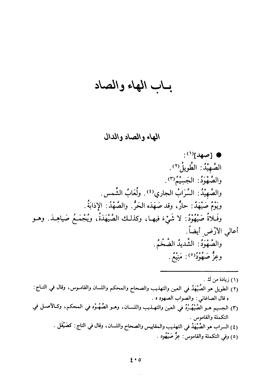 صهد الصَّهِيْدُ : الطَّويلُ . والصَّهْوَدُ : الجَسِيْمُ . والصَّهِيْدُ : السَّرَابُ الجاري . ولُعَابُ الشَّمس . ويَوْمٌ صَهْيَدٌ : حارٌّ ، وقد صَهَدَه الحَرُّ ، والصَّهْدُ : الإذابَةُ . وفَلاةٌ صَيْهُوْدٌ : لا شَيْءَ فيها ، وكذلك الصَّيْهَدَةُ ، ويُجْمَعُ صَياهِدَ ، وهو أعالي الأرْضِ أيضاً . والصَّهْوَدُ : الشَّديدُ الضَّخْمُ . وعِزٌّ صَهُوْدٌ : مَنِيْعٌ .