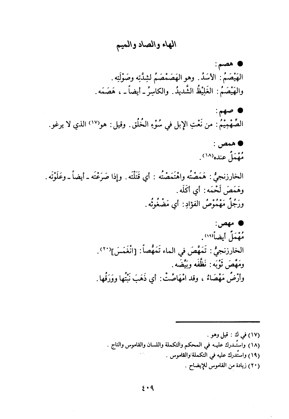 هصم الهَيْصَمُ : الأسَدُ . وهو الهَصَمْصَمُ لشِدَّتِه وصَوْلَتِه . والهَيْصَمُ : الغَلِيْظُ الشَّديدُ . والكاسِرُ - أيضاً - ، هَصَمَه . صهم الصِّهْمِيْمُ : من نَعْتِ الإبل في سُوْءِ الخُلُق . وقيل : هو الذي لا يرغو . همص مُهْمَلٌ عنده . الخارزنجي : هَمَصْتُه واهْتَمَصْتُه : أي قَتَلْتَه . وإذا صَرَعْتَه - أيضاً - وعَلَوْتَه . وهَمَصَ لَحْمَه : أي أكَلَه . ورَجُلٌ مَهْمُوْصُ الفؤادِ : أي مَضْغُوثُه . مهص مُهْمَلٌ أيضاً . الخارزنجي : تَمَهَّصَ في الماء تَمَهُّصاً : انْغَمَسَ . ومَهَّصَ ثّوْبَه : نَظَّفَه وبَيَّضَه . وأرْضٌ مَهْصَاءُ ، وقد امْهَاصَّتْ : أي ذَهَبَ نَبْتُها ووَرَقُها .