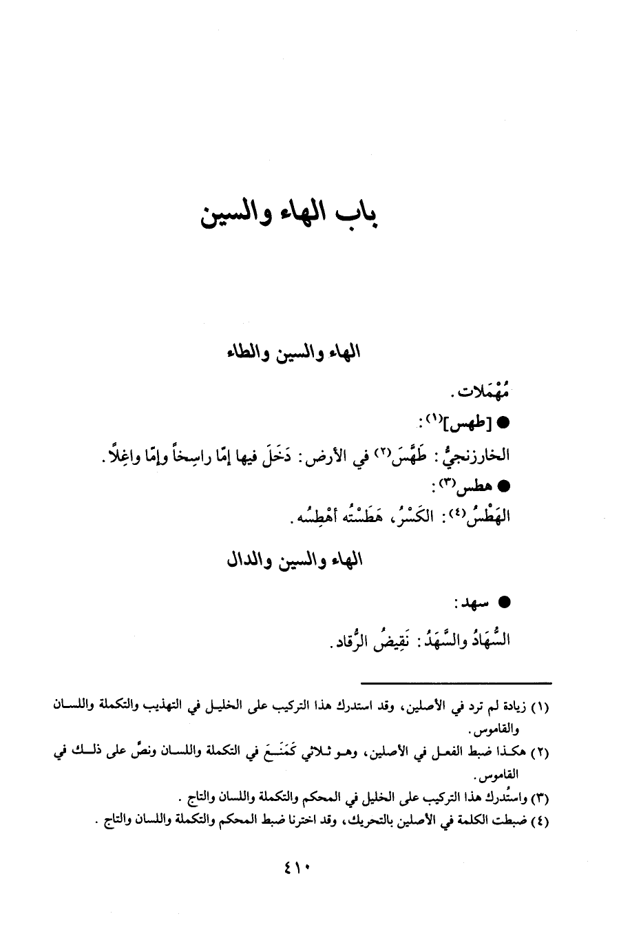 مهملاتٌ . طهس الخارزنجي : طَهَّسَ في الأرض : دَخَلَ فيها إمّا راسِخاً وإمّا واغِلاً . هطس الهَطْسُ : الكَسْرُ ، هَطَسْتُه أهْطِسُه .