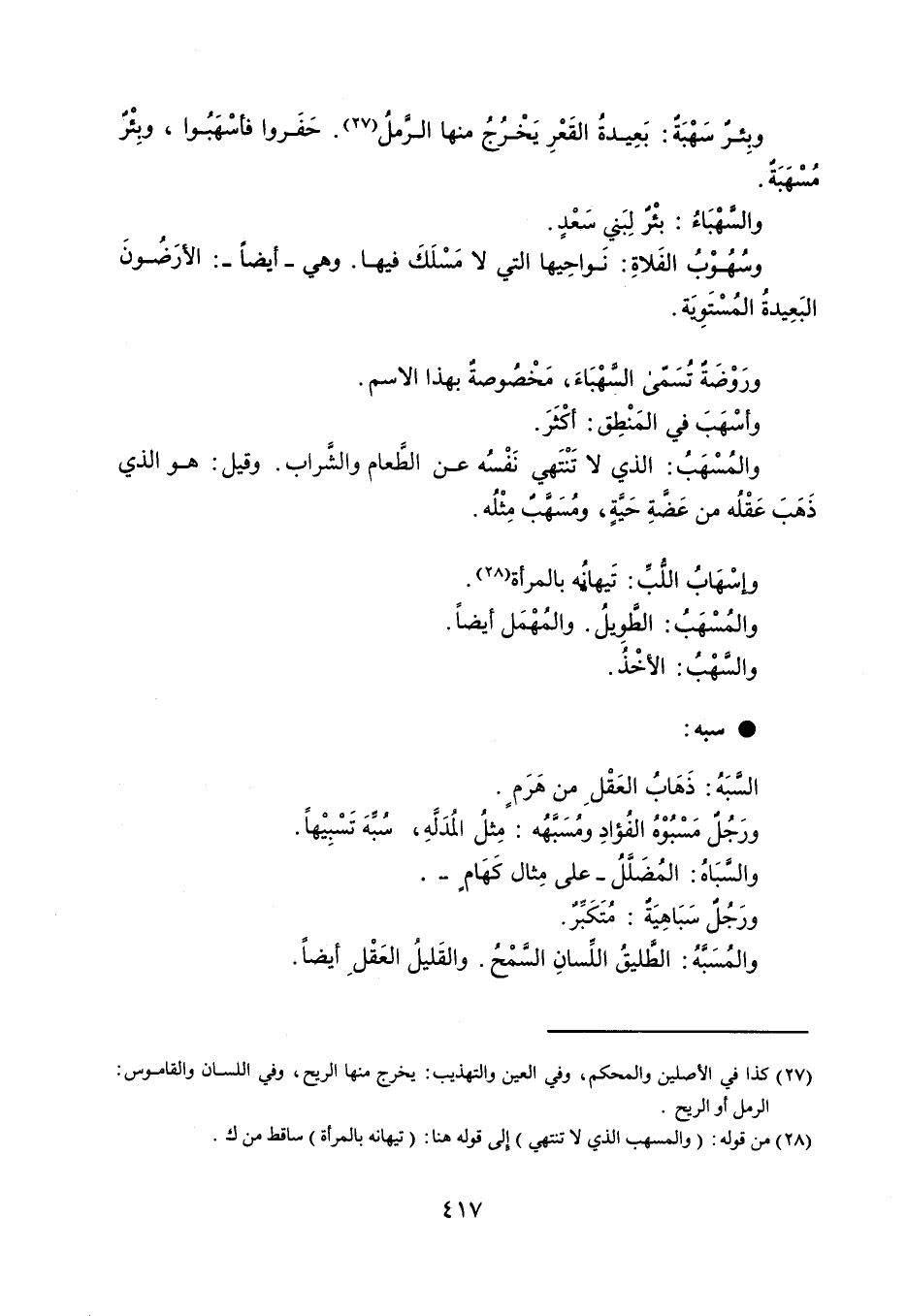 وبِئرٌ سَهْبَةٌ : بَعِيدةُ القَعْرِ يَخْرُجُ منها الرَّملُ ، حَفَروا فأسْهَبُوا ، وبِئْرٌ مُسْهَبَةٌ . والسَّهْبَاءُ : بئْرٌ لِبَنيِ سَعْدٍ . وسُهُوْبٌ الفَلاةِ : نَواحِيها التي لا مَسْلَكَ فيها . وهي أيضاً - : الأرَضُونَ البَعِيدةُ المُسْتَوِيَة . ورَوضَةٌ تُسَمّى السَّهْبَاءَ ، مَخْصُوصةٌ بهذا الاسم . وأسْهَبَ في المَنْطِق : أكْثَرَ . والمُسْهَبُ : الذي لا تَنْتَهي نَفْسُه عن الطَّعام والشًّراب . وقيل : هو الذي ذَهَبَ عَقْلُه من عَضَّةِ حَيَّةٍ ، ومُسَهَّبٌ مِثْلُه . وإسْهَابُ اللُّبِّ : تَيهانُه بالمرأة . والمُسْهَبُ : الطَّويلُ ، والمُهْمَل أيضاً . والسَّهْبُ : الأخْذُ . سبه السَّبَهُ : ذَهَابُ العَقْلِ من هَرَمٍ . ورَجُلٌ مَسْبُوْهُ الفُؤادِ ومُسَبَّهُة : مِثلُ المُدَلَّةِ ، سُبِّهَ تَسْبِيْهاً . والسَّبَاهُ : المُضَلَّلُ - على مِثال كَهَامٍ - . ورَجُلٌ سَبَاهِيَةٌ : مُتَكَبِّرٌ . والمُسَبَّهُ : الطَّليقُ اللِّسانِ السَّمْحُ . والقَليلُ العَقْلِ أيضاً .