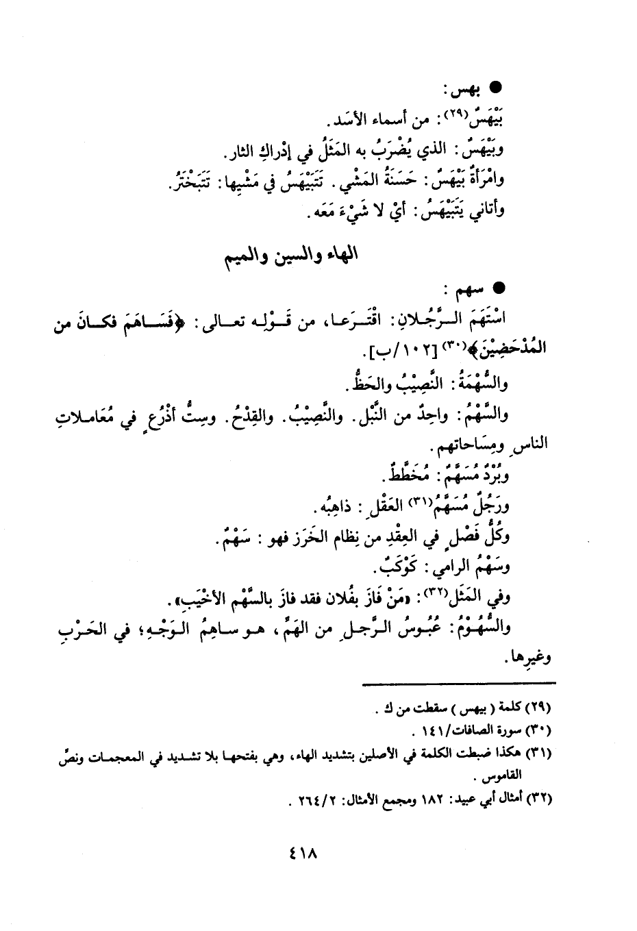 سهم اسْتَهَمَ الرَّجُلانِ : اقْتَرَعا ، من قَوْلِه تعالى : ' فَسَاهَمَ فكانَ من المُدْحَضِيْنَ ' . والسُّهْمَةُ : النَّصِيْبُ والحَظُّ . والسَّهْمُ : واحِدٌ من النَّبْل . والنَّصِيْبُ : . والقِدْحُ : وسِتُّ أذْرُعٍ في مُعَاملاتِ الناسِ ومِسَاحاتهم . وبُرْدٌ مُسَهَّمٌ : مُخَطَّطٌ . ورَجُلٌ مُسَهَّمُ العَقْلِ : ذاهِبُه . وكُلُّ فَصْلٍ في العِقْدِ من نِظام الخَرَز فهو : سَهْمٌ . وسَهْمُ الرامي : كَوْكَبٌ . وفي المَثَل : مَنْ فَازَ بفُلان فقد فازَ بالسَّهْم الأخْيَبِ . والسُّهُوْمُ : عُبُوسُ الرَّجلِ من الهَمِّ ، وهو ساهِمُ الوَجْهِ ، في الحَرْبِ وغيرِها .