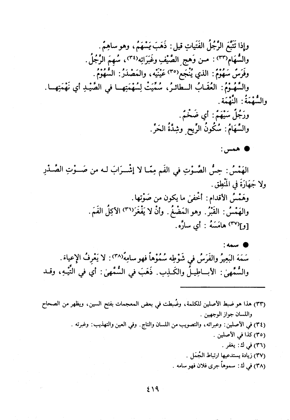 وإذا تَتَبَّعَ الرَّجُلُ الفَتَياتِ قيل : ذَهَبَ يَسْهَمُ ، وهو ساهِمٌ . والسُّهَام : من وَهجِ الصَّيْفِ وغَبَرَاتِه ، سُهِمَ الرَّجُلُ . وفَرَسٌ سَهُوْمٌ : الذي يُنْجَع عَيْنَيْه ، والمَصْدَرُ : السُّهُوْمُ . والسَّهُوْمُ : العُقَابُ الطائرُ ، سُمِّيَتْ لِسُهْمَتِها في الصَّيْدِ أي نَهْمَتِها . والسُّهْمَةُ : النًّهْمَة . ورَجُلٌ سَيْهَمٌ : أي ضَخْمٌ . والسَّهَامُ : سُكُونُ الرِّيحِ وشِدَّةُ الحَرِّ . همس الهَمْسُ : حِسُّ الصَّوْتِ في الفَم مِمّا لا إشْرَابَ له من صَوْتِ الصَّدْرِ ولا جَهَارَةَ في المَنْطِق . وهَمْسُ الأقدام : أخْفى ما يكون من صَوْتها . والهَمْسُ : القَبْرُ . وهو المَضْغُ ، وأنْ لا يَفْغَرَ الآكِلُ الفَمَ . وهامَسَهُ : أي سارَّه . سمه سَمَهَ البَعِيرُ والفَرَسُ في شَوْطِه سُمُوْها فهو سامِهٌ : لا يَعْرِفُ الإِعياءَ . والسُّمَّهى : الأباطِيلُ والكَذبِ ، ذَهَبَ في السُّمَّهى : أي في التِّيْهِ ، وقد
