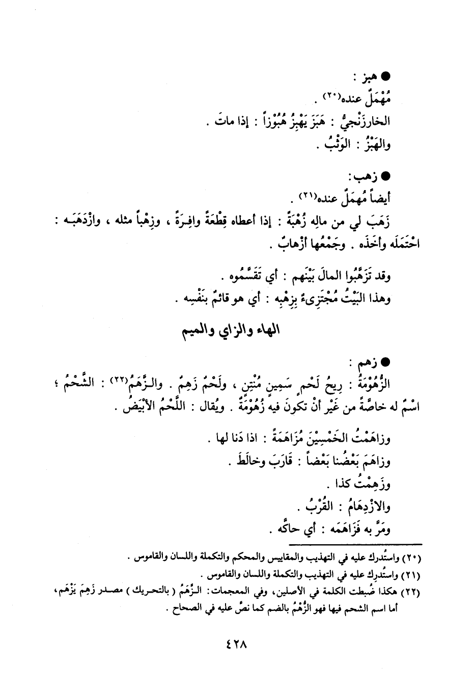 هبز مُهْمَلٌ عنده . الخارزنجي : هَبَزَ يَهْبِزُ هُبُوْزاً : إذا ماتَ . والهَبْزُ : الوَثْبُ . زهب أيضاً مُهمَلٌ عنده . زَهَبَ لي من مالِه زُهْبَةٌ : إذا أعطاه قِطْعَةً وافِرَةً ، وزِهْباً مثله . وازْدَهَبَه : احْتَمَلَه وأخَذَه ، وجَمْعُها أزْهابٌ . وقد تَزَهَّبُوا المالَ بَيْنَهم : أي تَقَسَّمُوه . وهذا البَيْتُ مُجْتَزِئٌ بِزِهْبِه : أي هو قائمٌ بنَفْسِه .