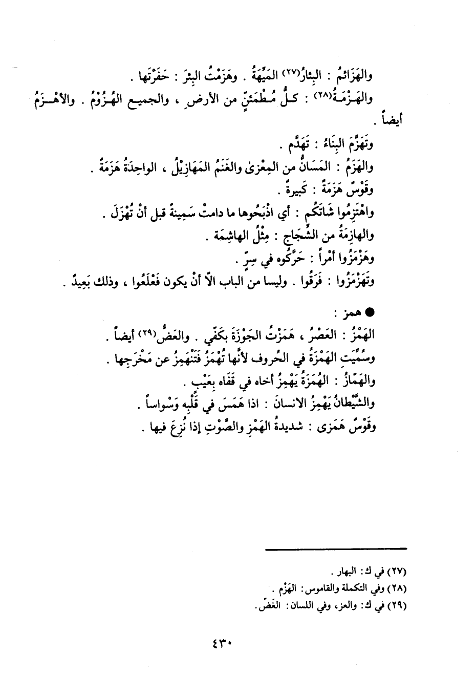 والهَزَائمُ : البِئارُ المَيِّهَةُ . وهَزَمْتُ البِئرَ : حَفَرْتَها . والهَزْمَةُ : كلُّ مُطْمَئنّ من الأرضِ ، والجميع الهُزُوْمُ ، والأهْزَمُ أيضاً . وتَهَزَّمَ البِنَاءُ : تَهَدَّم . والهَزَمُ المَسَانُّ من المِعْزى والغَنَمُ المَهَازِيْلُ ، الواحِدَةُ هَزَمَةٌ . وقَوْسٌ هَزَمَةٌ : كَبيرةٌ . واهْتَزِمُوا شَاتَكُم : أي اذْبَحُوها ما دامتْ سَمِينةً قبل أنْ تُهْزَلَ . والهازِمَةُ من الشِّجَاج : مِثْلُ الهاشِمَة . وهَزْمَزُوا أمْراً : حَرَّكُوه في سِرٍّ . وتَهَزْمَزُوا : فَرَقُوا ، وليسا من الباب إلاّ أنْ يكون فَعْلَعُوا ، وذلك بَعِيدٌ . همز الهَمْزُ : العَصْرُ ، هَمَزْتُ الجَوْزَةَ بكَفّي . والعَضُّ أيضاً . وسُمِّيَتِ الهَمْزَةُ في الحُروف لأنَّها تُهْمَزُ فَتَنْهَمِزُ عن مَخْرَجِها . والهَمّازُ : الهُمَزَةُ يَهْمِزُ أخاه في قَفَاه بِعَيْبٍ . والشَّيْطانُ يَهْمِزُ الإنسانَ : إذا هَمَسَ في قَلْبِه وَسْواساً . وقَوْسٌ هَمَزى : شديدةُ الهَمْزِ والصًّوْتِ إذا نُزِعَ فيها .