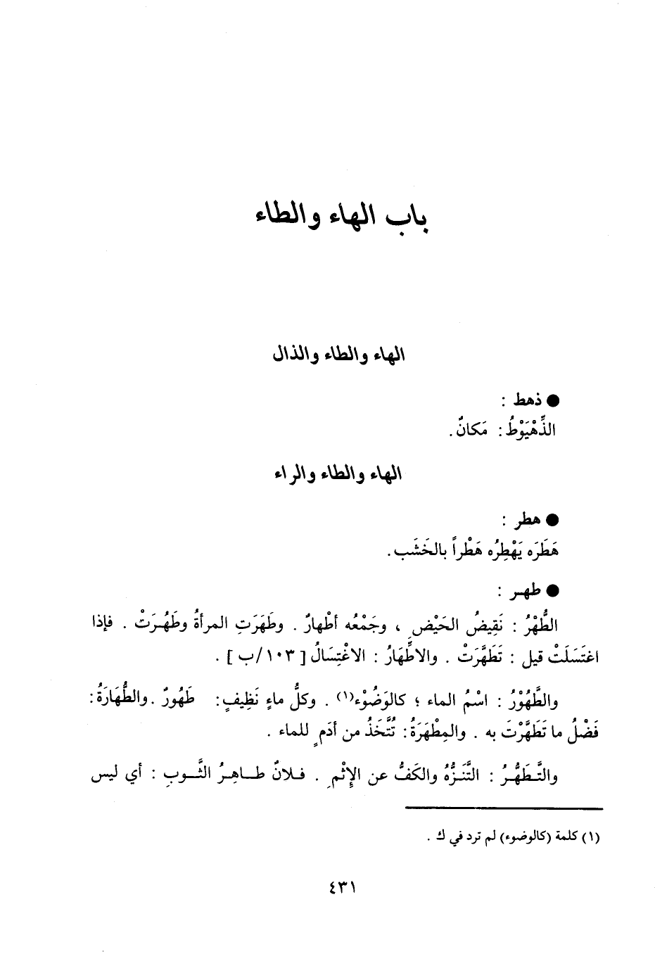 هطر هَطَرَه يَهْطِرُه هَطْراً بالخَشَب . طهر الطُّهْرُ : نَقِيضُ الحَيْضِ ، وجَمْعُه أطْهارٌ ، وطَهَرَتِ المرأةُ وطَهُرَتْ ، فإذا اغَتَسَلَتْ قيل : تَطَهَّرَتْ . والإطِّهَارُ : الاغْتِسَالُ . والطَّهُوْرُ : اسْمُ الماء ، كالوَضُوْء ، وكلُّ ماءٍ نَظِيفٍ : طَهُورٌ . والطُّهَارَةُ : فَضْلُ ما تَطَهَّرْتَ به . والمِطْهَرَةُ : تُتَّخَذُ من أدَمٍ للماء . والتَّطَهُّرُ : التَّنَزُّهُ والكَفُّ عن الإثْمِ . فلانٌ طاهِرُ الثَّوبِ : أي ليس