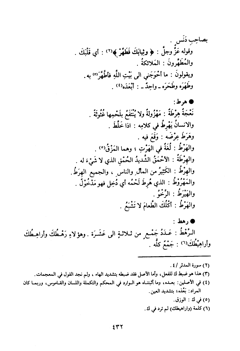 بصاحِبِ دَنَسٍ . وقوله عزَّ وجلَّ : ' وثِيابَكَ فَطَهِّرْ ' أي قَلْبَكَ . والمُطَهَّرونَ : المَلائكةُ . ويقولونَ : ما أحْوَجَني إلي بَيْتِ اللَّهِ فأطَّهَّرَ به . وطَهَرَه وطَحَرَه - واحِدٌ - : أبْعَدَه . هرط نَعْجَةٌ هِرْطَةٌ : مَهْزُولة ولا يُنْتَفَعُ بلَحْمِها غُثُوثَةً . والإنسان يَهْرِطُ في كلامِه . إذا خَلَّطَ . وهَرَطِ عِرْضَه : وَقَعَ فيه . والهَرْطُ : لُغَةٌ في الهَرْتِ ، وهما المَزْقُ . والهِرْطَةُ : الأحْمَقُ الشَّديدُ الحُمْقِ الذي لا شَيْءَ له . والهِرْطُ : الكَثِيرُ من المالِ والناسِ ، والجميع الهِرَطُ . والمَهْرُوْطُ : الذي هُرِطَ لَحْمُه أي دُخِل فهو مَدْخُوْلٌ . والهَيْرَطُ : الرِّخْوُ . والهَرْطُ : أكْلُكَ الطَّعامَ لا تَشْبَعُ . رهط الرَّهْطُ : عَدَدُ جَمْعٍ من ثلاثةٍ إلى عَشَرَة ، وهؤلاءِ رَهْطُكَ وأراهِطُكَ وأراهِيْطُكَ : جَمْعٌ كلُّه .