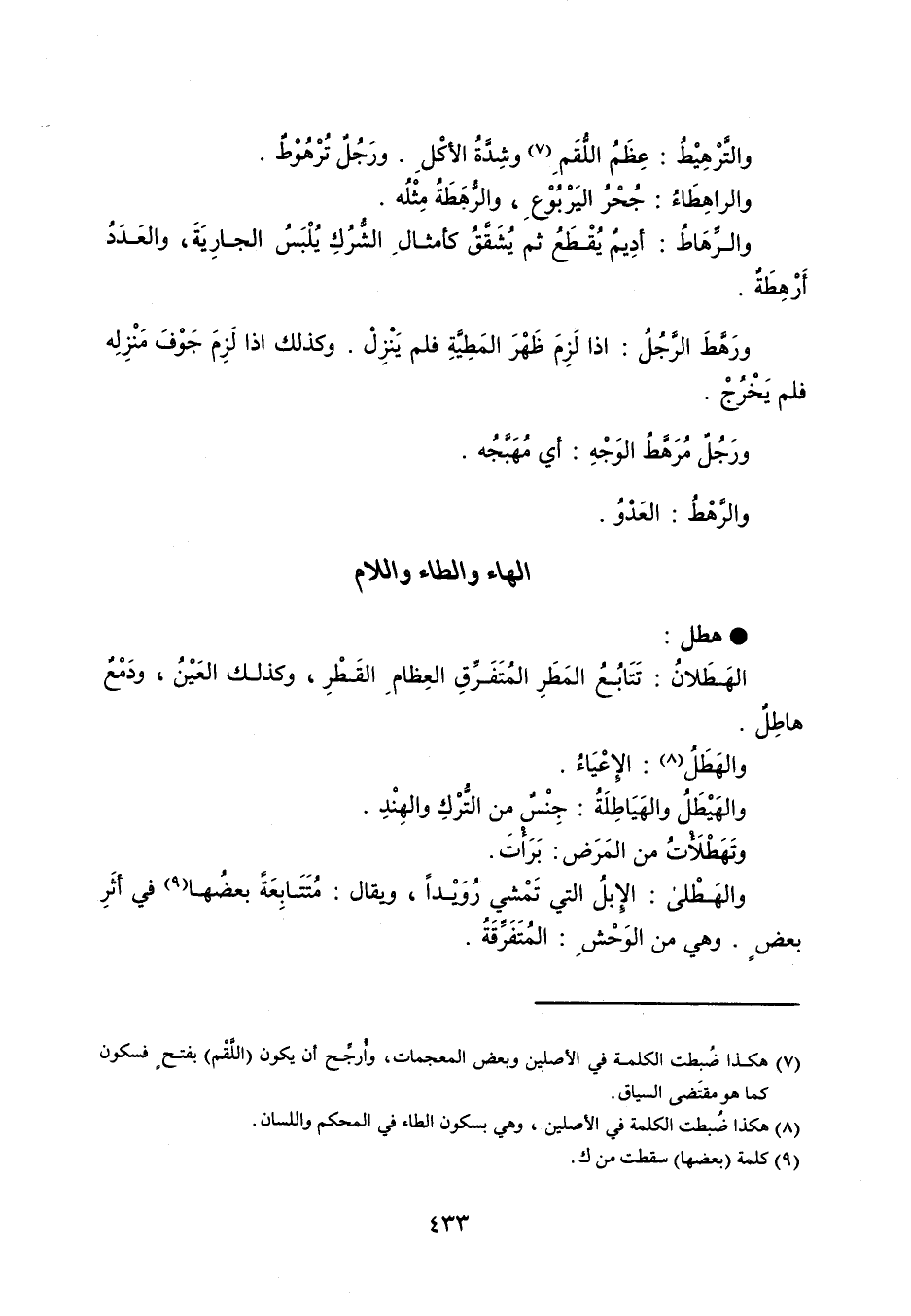 هطل الهَطَلانُ : تَتَابُعُ المَطَرِ المُتَفَرِّقِ العِظامِ القَطْرِ ، وكذلك العَيْنُ ، ودَمْعٌ هاطِلٌ . والهَطَلُ : الإِعْيَاءُ . والهَيْطَلُ والهَيَاطِلَةُ : جِنْسٌ من التُّرْكِ والهِنْدِ . وتَهَطْلاْتُ من المَرَض : بَرَأْتَ . والهَطْلى : الإبلُ التي تَمْشي رُوَيْداً ، ويقال : مُتَتَابِعَةً بعضُها في أثَرِ بعضٍ . وهي من الوَحْشِ : المُتَفَرِّقَةُ .