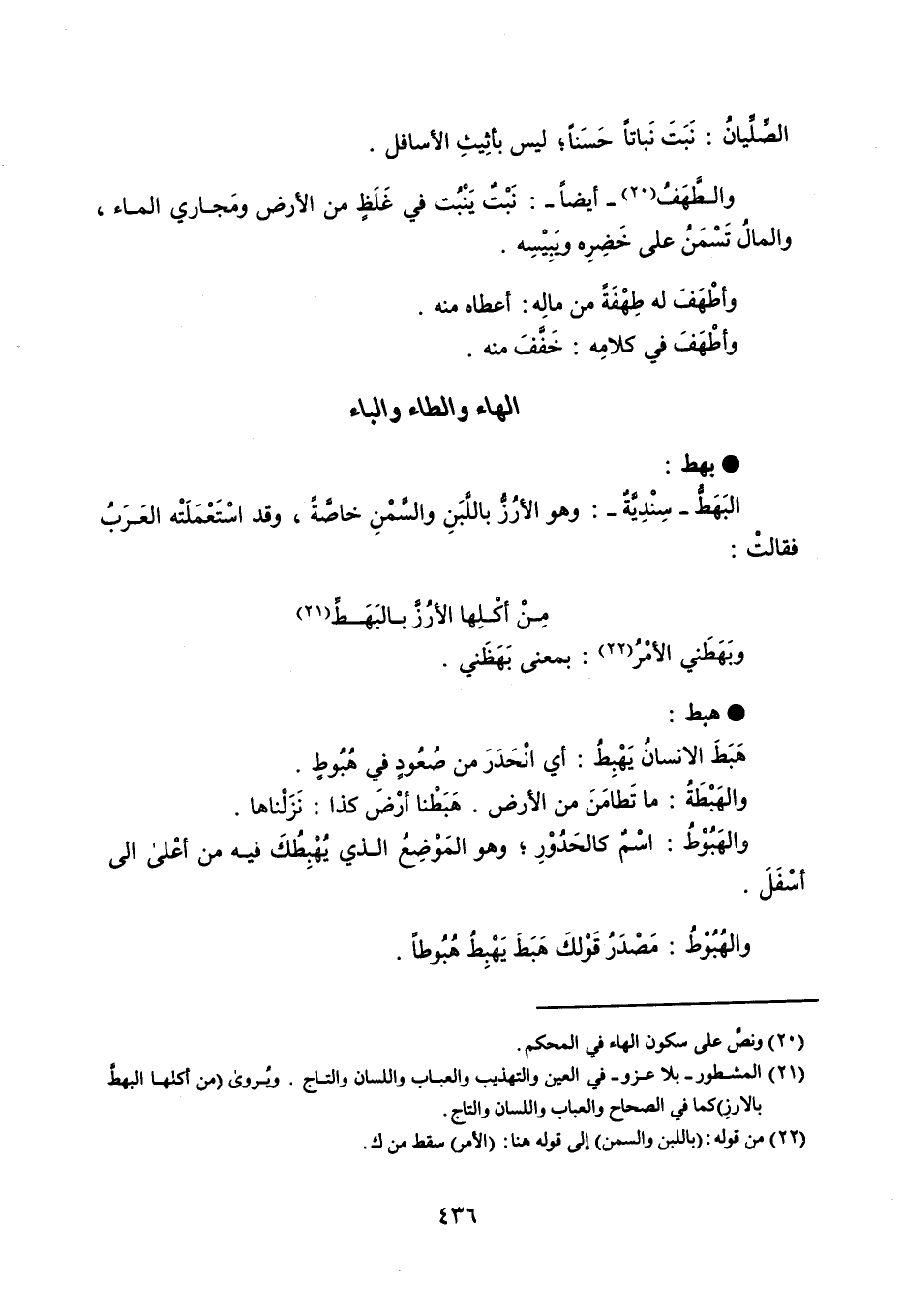 بهط البَهَطُّ - سِنْدِيَّةٌ - : وهو الأرُزُّ باللَّبَنِ والسَّمْنِ خاصَّةً ، وقد اسْتَعْمَلَتْه العَرَبُ فقالت : مِنْ أكْلِها الأرُزَّ بالبَهَطِّ وبَهَطَني الأمْرُ : بمعنى بَهَظَني . هبط هَبَطَ الإنسان يَهْبِطُ : أي انْحَدَرَ من صُعُودٍ في هُبُوطٍ . والهَبْطَةُ : ما تَطامَنَ من الأرض ، هَبَطْنا أرْضَ كذا : نَزَلْناها . والهَبُوْطُ : اسْمٌ كالحَدُوْرِ ، وهو المَوْضِعُ الذي يُهْبِطُكَ فيه من أعْلى إلى أسْفَلَ . والهُبُوْطُ : مَصْدَرُ قَوْلكَ هَبَطَ يَهْبِطُ هُبُوطاً .