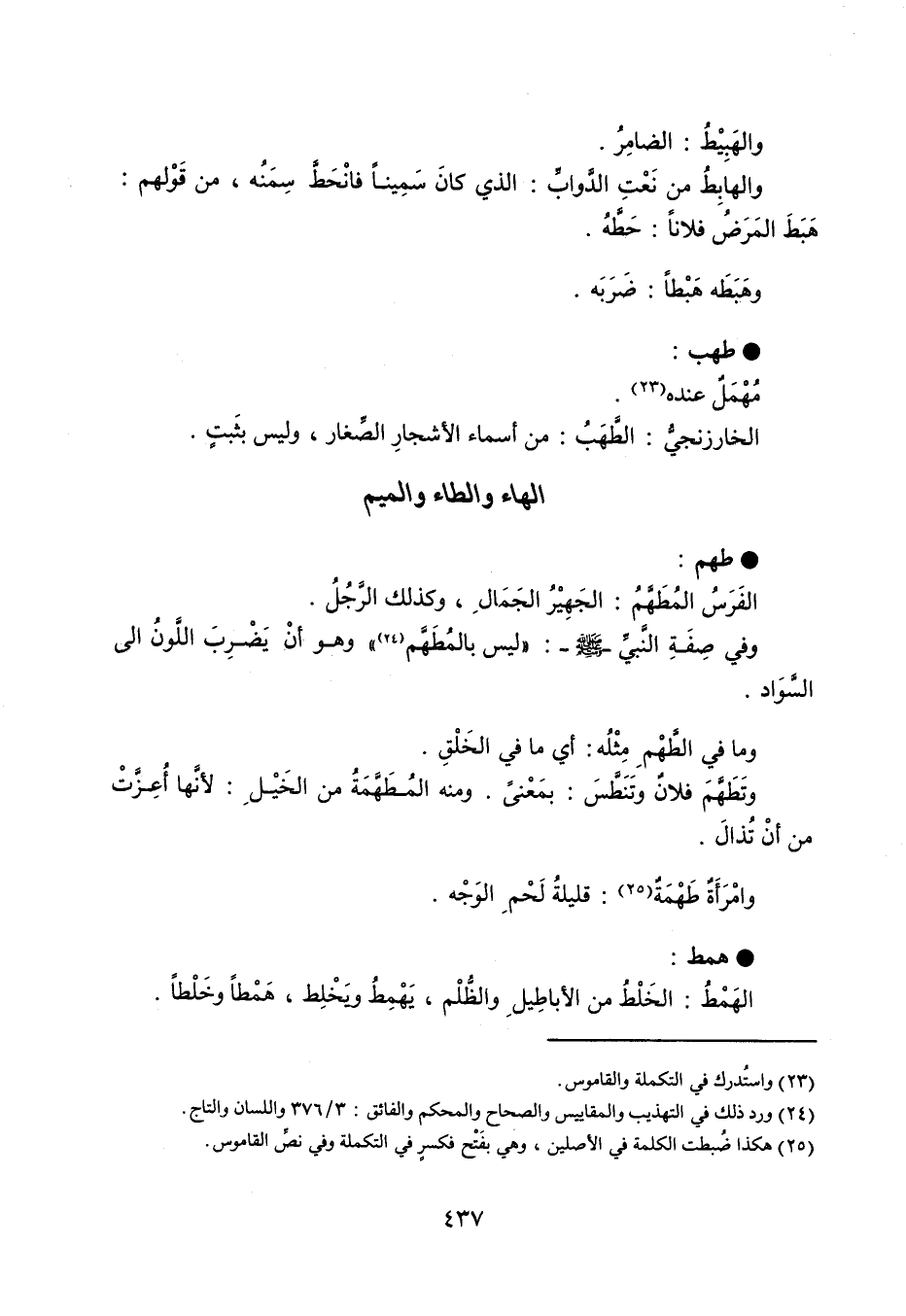 طهم الفَرَسُ المُطَهَّمُ : الجَهِيْرُ الجَمَالِ ، وكذلك الرَّجُلُ . وفي صِفَةِ النبي ـ صلى الله عليه وسلم ـ : ' ليس بالمُطَهَّم ' وهو أنْ يَضْرِبَ اللَّونُ إلى السَّوَاد . وما في الطَّهْمِ مِثْلُه : أي ما في الخَلْقِ . وتَطَهَّمَ فلانٌ وتَنَطَّسَ : بمَعْنىً . ومنه المُطَهَّمَةُ من الخَيْلِ : لأنَّها أُعِزَّتْ من أنْ تُذالَ . وامْرَأَةٌ طَهْمَةٌ : قليلةٌ لَحْمِ الوَجْه . همط الهَمْطُ : الخَلْطُ من الأباطِيلِ والظُّلْم ، يَهْمِطُ ويَخْلِط ، هَمْطاً وخَلْطاً .