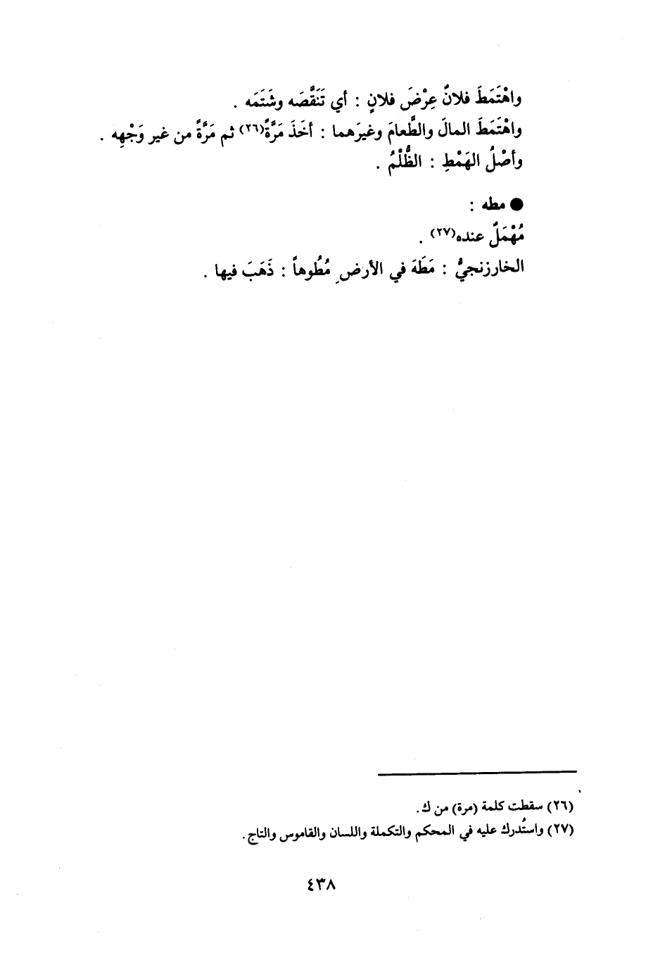 واهْتَمَطَ فلانٌ عِرْضَ فلانٍ : أي تَنَقَّصَه وشَتَمَه . واهْتَمَطَ المالَ والطَّعامَ وغيرَهما : أخَذَ مَرَّةً ثم مرةً من غير وَجْهِه . وأصْلُ الهَمْطِ : الظُّلْمُ . مطه مُهْمَلٌ عنده . الخارزنجي : مَطَهَ في الأرضِ مُطُوهاً : ذَهَبَ فيها .
