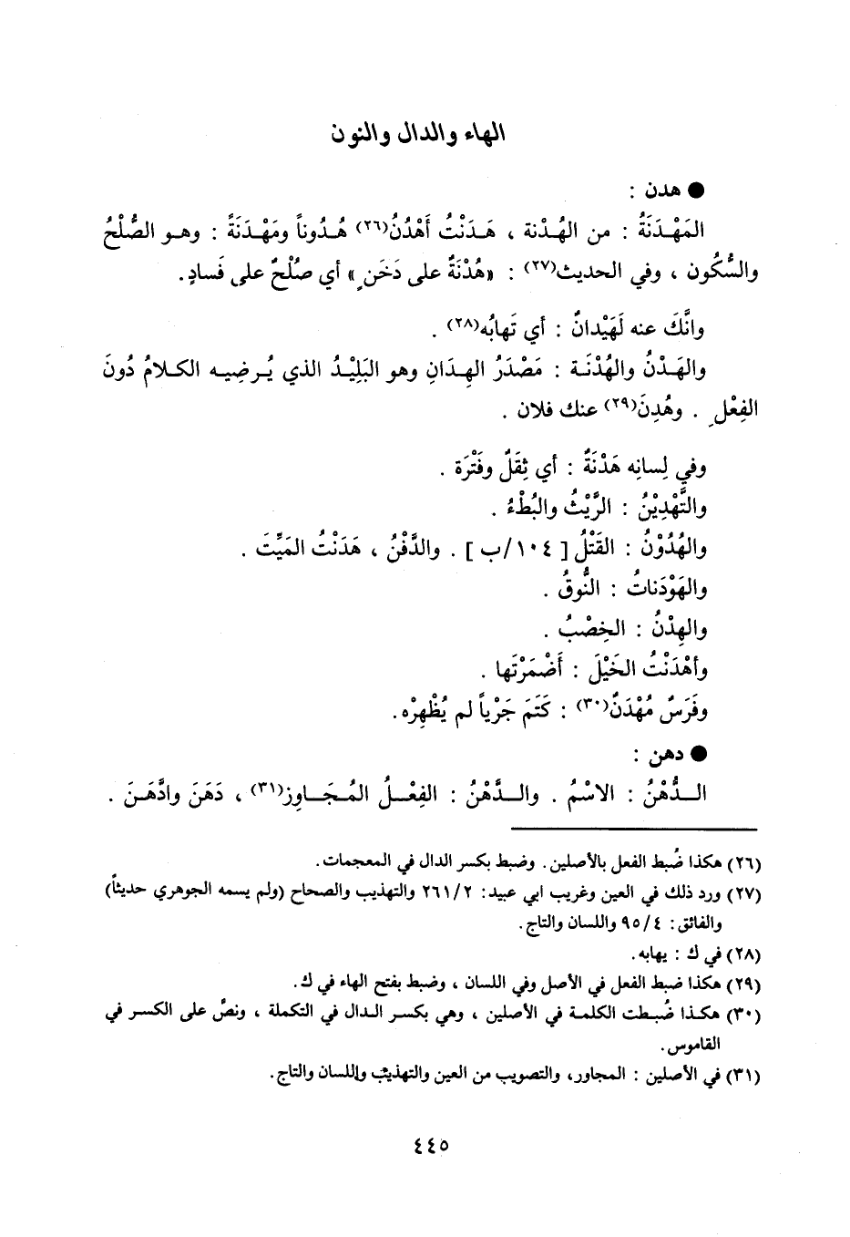 هدن المَهْدَنَةُ : من الهُدْنة ، هَدَنْتُ أَهْدُنُ هُدُوناً ومَهْدَنَةً : وهو الصُّلْحُ والسُّكُون ، وفي الحديث : ' هُدْنَةٌ على دَخَنٍ ' أي صُلْحٌ على فَسادٍ . وإنَّكَ عنه لَهَيْدانٌ : أي تَهابُه . والهَدْنُ والهُدْنَة : مَصْدَرُ الهِدَانِ وهو البَلِيْدُ الذي يُرضِيه الكلامُ دُونَ الفِعْلِ ، وهُدِنَ عنك فلان . وفي لِسانِه هَدْنَةٌ : أي ثِقَلٌ وفَتْرَة . والتَّهْدِيْنُ : الرَّيْثُ والبُطْءُ . والهُدُوْنُ : القَتْلُ . والدَّفْنُ : هَدَنْتُ المَيِّتَ . والهَوْدَناتُ : النُّوقُ . والهِدْنُ : الخِصْبُ . وأهْدَنْتُ الخَيْلَ : أضْمَرْتَها . وفَرَسٌ مُهْدَنٌ : كَتَمَ جَرْياً لم يُظْهِرْه . دهن الدُّهْنُ : الاسْمُ ، والدَّهْنُ : الفِعْلُ المُجَاوِز ، دَهَنَ وادَّهَنَ .