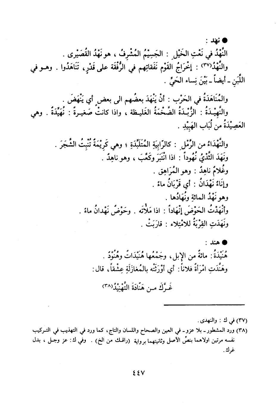 نهد النَّهْدُ في نَعْتِ الخَيْلِ : الجَسِيْمُ المُشْرِفُ ، وهو نَهْدُ القُصَيْري . والنَّهْدُ : إخْرَاجُ القَوْم نَفَقاتِهم في الرُّفْقَة على قَدْرٍ ، تَنَاهَدُوا ، وهو في اللَّبَنِ - أيضأً - بَيْنِ نِساء الحَيِّ . والمُنَاهَدَةُ في الحَرْب : أنْ يَنْهَدَ بعضُهم إلى بعضٍ أي يَنْهَضَ . والنَّهِيْدَةُ : الزُّبْدَةُ الضَّخْمَةُ الغَليظة ، وإذا كانتْ صَغيرةً : نُهَيِّدَةٌ . وهي العَصِيْدَةُ من لُبَاب الهَبِيْدِ . والنَّهْدَاءُ من الرَّمْلِ : إذا انْتَبَرَ وكَعَّبَ ، وهو ناهِدٌ . وغُلام ناهِدٌ : وهو المُراَهِق . وإنَاءٌ نَهْدَانُ : أي قَرْبَانُ ماءً . وهو نَهْدُ المائةِ ونُهَادُها . وأنْهَدْتُ الحَوْضَ إنْهَاداً : إذا مَلأْتَه ، وحَوْضٌ نَهْدانُ ماءً . ونَهَدَتِ القِرْبَةُ للأمْتِلاء : قارَبَتْ . هند هُنَيْدَةُ : مائةٌ من الإبل ، وجَمْعُها هُنَيْدَاتٌ وهُنُوْدٌ . وهَنَّدَتِ امْرَأةٌ فلاناً : أي أوْرَثَتْه بالمُغازَلَةِ عِشْقاً . قال : غَرَّكَ من هَنّادَةَ التَّهْنِيدُ