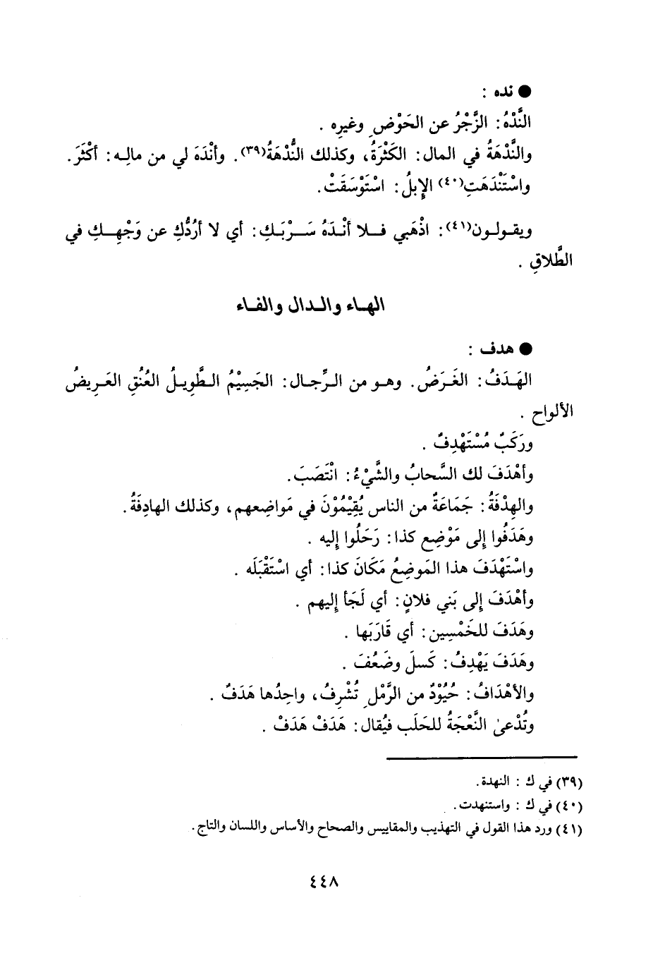 نده كالرّابية المتلّبدة ، وهي كريمة تنبت الشجر . ونهد الثدي نهوداً . النَّدْهُ : الزَّجْرُ عن الحَوْضِ وغيرِه . والنَّدْهَةُ في المال : الكَثْرَةُ ، وكذلك النُّدْهَةُ ، وأنْدَهَ لي من مالِه : أكْثَرَ واسْتَنْدَهَتِ الإبلُ : اسْتَوْسَقَتْ . ويقولون : اذْهَبي فلا أنْدَهُ سَرْبَكِ : أي لا أرُدُّكِ عن وَجْهِكِ في الطَّلاقِ .