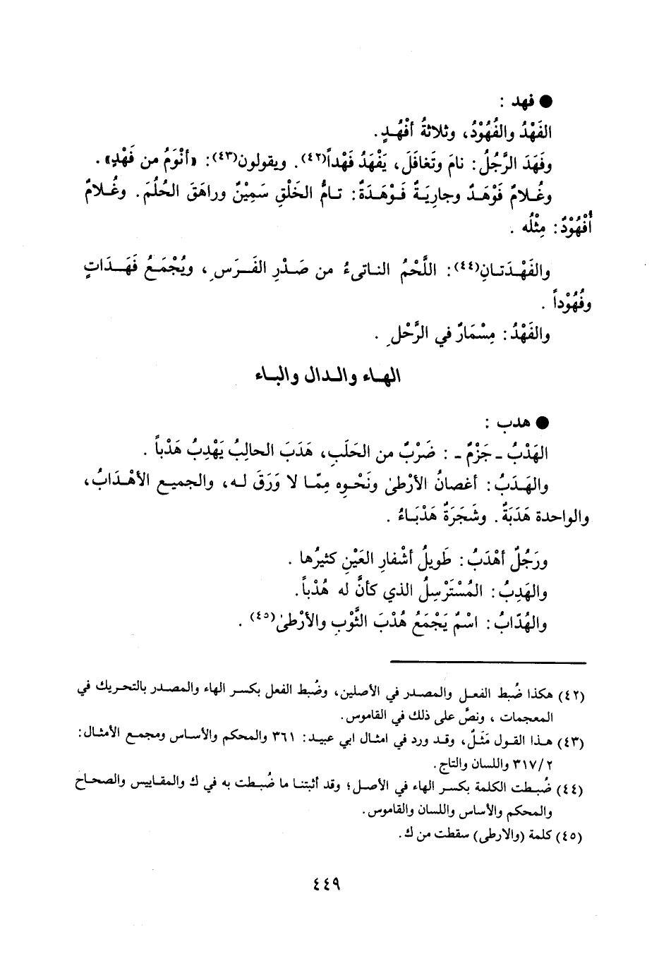 فهد الفَهْدُ والفُهُوْدُ ، وثلاثةُ أفْهُدٍ . وفَهَدَ الرَّجُلُ : نامَ وتَغافَلَ ، يَفْهَدُ فَهْداً ويقولون : ' أنْوَمُ من فَهْدٍ ' . وغُلامٌ فَوْهَدٌ وجارِيَةٌ فَوْهَدَةٌ : تامٌّ الخَلْقِ سَمِيْنٌ وراهَقَ الحُلُمَ وغُلامٌ أُفْهُوْد : مِثْلُه . والفَهْدَتانِ : اللَّحْمُ الناتئُ من صَدْرِ الفَرَسِ ، ويُجْمَعُ فَهَدَاتٍ وفُهُوْداً . والفَهْدُ : مِسْمَارٌ في الرَّحْلِ .