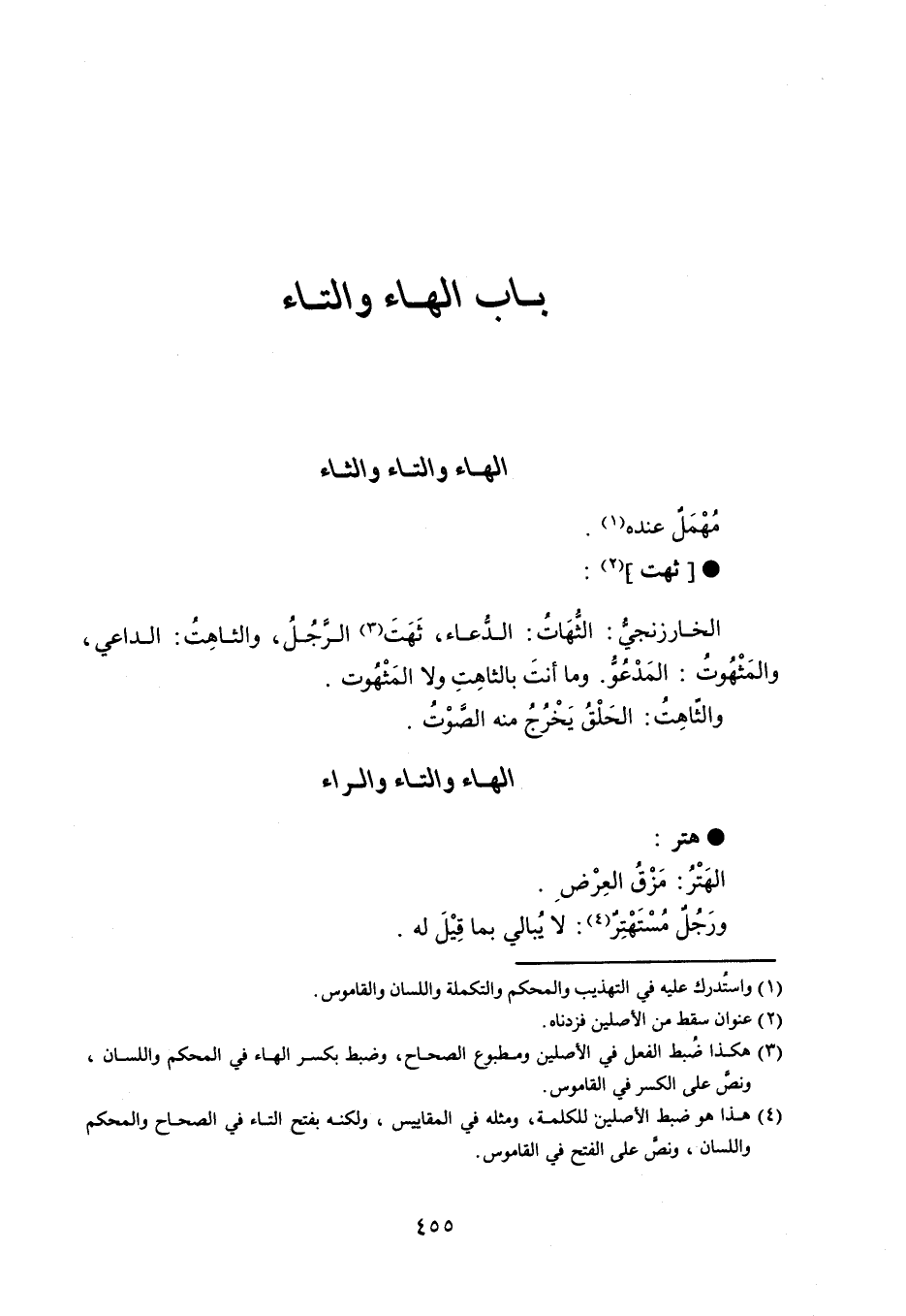 مُهْمَلٌ عنده . ثهت الخارزنجي : الثُّهَاتُ : الدُّعاء ، ثَهَتَ الرَّجُلُ : والثاهِتُ : الداعي ، والمَثْهُوتُ : المَدْعُوُّ ، وما أنتَ بالثاهِتِ ولا المَثْهُوت . والثّاهِتُ : الحَلْقُ يَخْرُجُ منه الصَّوْتُ .