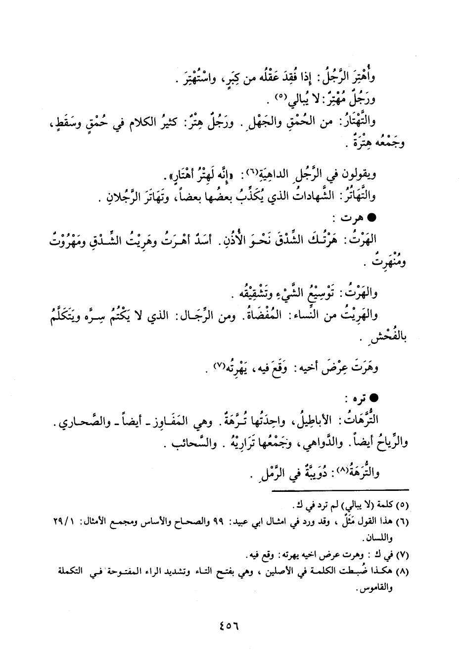 وأُهْتِرَ الرَّجُلُ : إذا فُقِدَ عَقْلُه من كَبِرٍ ، واسْتُهْتِرَ . ورَجُلٌ مُهْتِرٌ : لا يُبالي . والتَّهْتَارُ : من الحُمْقِ والجَهْلِ ، ورَجُلٌ هِتْرٌ : كثيرُ الكلام في حُمْقٍ وسَقَطٍ ، وجَمْعُه هِتْرَةٌ . ويقولون في الرَّجُلِ الداهِيَة : إنَّه لَهِتْرُ أهْتَارٍ . والتَّهَاتُرُ : الشَّهاداتُ الذي يُكَذِّبُ بعضُها بعضاً ، وتَهَاتَرَ الرَّجُلانِ . هرت الهَرْتُ : هَرْتُكَ الشِّدْقَ نَحْوَ الأذُنِ ، أسَدٌ أهْرَتُ وهَرِيْتُ الشِّدْقِ ومَهْرُوْتٌ ومُنْهَرِتٌ . والهَرْتُ : تَوْسِيْعُ الشَّيْءِ وتَشْقِيْقُه . والهَرِيْتُ من النِّساء : المُفْضَاةُ ومن الرِّجَال : الذي لا يَكْتُمُ سِرَّه ويَتَكَلَّمُ بالفُحْشِ . وهَرَتَ عِرْضَ أخيه : وَقَعَ فيه ، يَهْرِتُه . تره التُّرَّهَاتُ : الأباطِيلُ ، واحِدَتُها تُرَّهَةٌ ، وهي المَفَاوِز - أيضاً - والصَّحاري . والرِّياحُ أيضاً . والدَّاوهي ، وجَمْعُها تَرَارِيْهُ . والسَّحائب . والتُّرَهَةُ : دُويبَّةٌ في الرَّمْلِ .