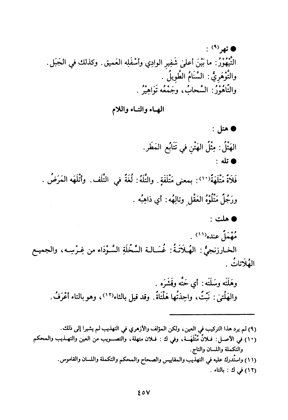 هتل الهَتْلُ : مِثْلُ الهَتْنِ في تَتَابُع المَطَر . تله فَلاَةٌ مَتْلَهَةٌ : بمعنى مَتْلَفَةٍ . والتَّلَه : لُغَةٌ في التَّلَف ، وأتْلَهَه المَرَضُ . ورَجُلٌ مَتْلُوْهُ العَقْلِ وتالِهُه : أي ذاهِبُه . هلت مُهْمَلٌ عنده . الخارزنجي : الهُلاَتَةُ : غُسَالة السَّخْلَةِ السَّوْدَاء من غِرْسِه ، والجميع الهُلاَتاتُ . وهَلَتَه وسَلَتَه : أي حَتَّه وقَشَرَه . والهَلْتى : نَبْتٌ واحِدَتُها هَلْتَاةٌ ، وقد قيل بالثاء ، وهو بالتاء أعْرَفُ .