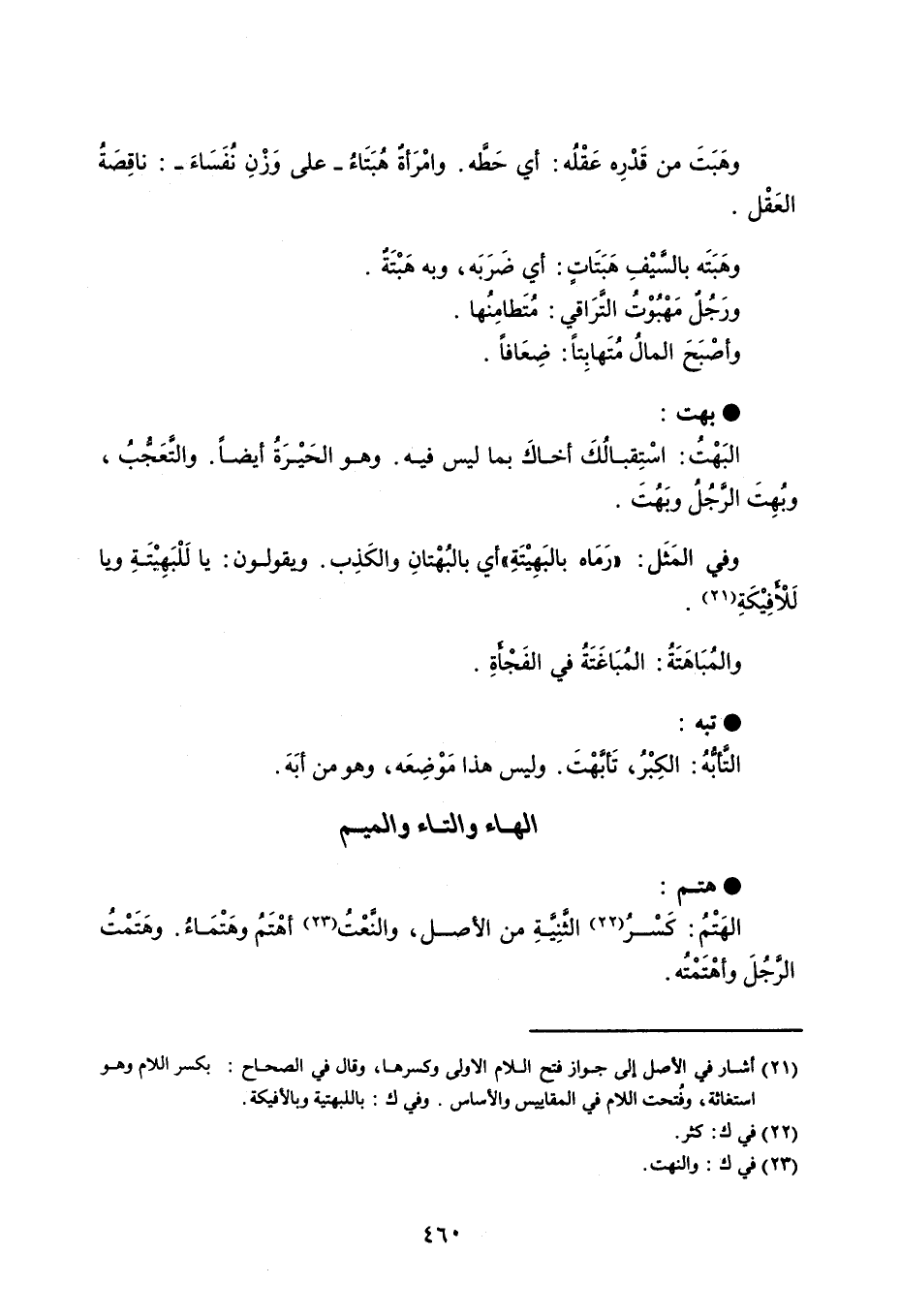 وهَبَتَ من قَدْرِه عَقْلُه : أي حَطَّه . وامْرَأةٌ هُبَتَاءُ - على وَزْنِ نُفَسَاءَ - : ناقِصَةُ العَقْل . وهَبَتَه بالسَّيْفِ هَبَتَاتٍ : أي ضَرَبَه ، وبه هَبْتَةٌ . ورَجُلٌ مَهْبُوْتُ التَّرَاقي : مُتَطامِنُها . وأصْبَحَ المالُ مُتَهابِتاً . : ضِعَافاً . بهت البَهْتُ : اسْتِقبالُكَ أخاكَ بما ليس فيه . وهو الحَيْرَةُ أيضاً ، والتَّعْجُّبُ ، وبُهِتَ الرَّجُلُ وبَهُتَ . وفي المَثَل : رَمَاه بالبَهِتْيَةِ أي بالبُهْتانِ والكَذِب . ويقولون : يا لَلْبَهِيتَةِ ويا لَلْأَفِيْكَةِ . والمُبَاهَتَةُ : المُبَاغَتَةُ في الفَجْأَةِ . تبه التَّأبُّهُ : الكِبْرُ ، تَأبَّهْتَ . وليس هذا مَوْضِعَه ، وهو من أبَهَ .