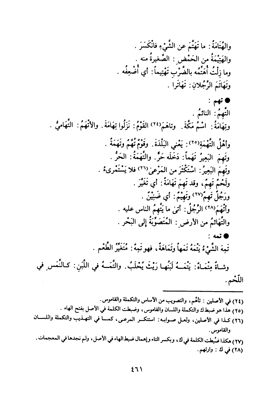 والهُتَامَةُ : ما تَهَتَّمَ عن الشَّيْءِ فانْكَسَرَ . والهَتِيْمَةُ من الحَمْضِ : الصَّغيرةُ منه . وما زِلْتُ أُهَتِّمُه بالضَّرْبِ تَهْتِيماً : أي أُضْعِفُه . وتَهَاتَمَ الرَّجُلانِ : تَهَاتَرا . تهم التَّهِمُ : النائمُ . وتِهَامَةُ : اسْمُ مَكَّةَ ، وتاهَمَ القَوْمُ : نَزَلُوا تِهَامَةَ ، والأتْهَمُ : التِّهَاميُّ . وأهْلُ التَّهْمَةِ : يَعْني البَلْدَةَ ، وقَوْمٌ تُهَّمٌ وتَهَمَةٌ . وتَهِمَ البَعِيرُ تَهَماً : دَخَلَه حَرٌّ . والتَّهَمَةُ : الحَرُّ . وتَهِمَ البَعِيرُ : اسْتَكْثَرَ من المَرْعى فلا يَسْتَمْرىءُ . ولَحْمٌ تَهِمٌ ، وقد تَهِمَ تَهَامَةً : أي تَغَيَّرَ . ورَجُلٌ تَهِمٌ وتَهِيْمٌ : أي ضَنِيْنٌ . وأتْهَمَ الرَّجُلُ : أتى ما يَتَّهِمُ الناس عليه . والتَّهَائمُ من الأرضِ : المُتَصَوِّبَةُ إلى البَحْر . تمه تَمِهَ الشَّيْءُ يِتْمَهُ تَمَهاً وتَمَاهَةً فهو تَمِهٌ : مُتَغَيِّرُ الطَّعْم . وشاةٌ مِتْمَاهٌ : يَتْمَهُ لَبَنُها رَيْثَ يُحْلَبُ ، والتَّمَهُ في اللَّبَنِ : كالنَّمَسِ في اللّحْم .