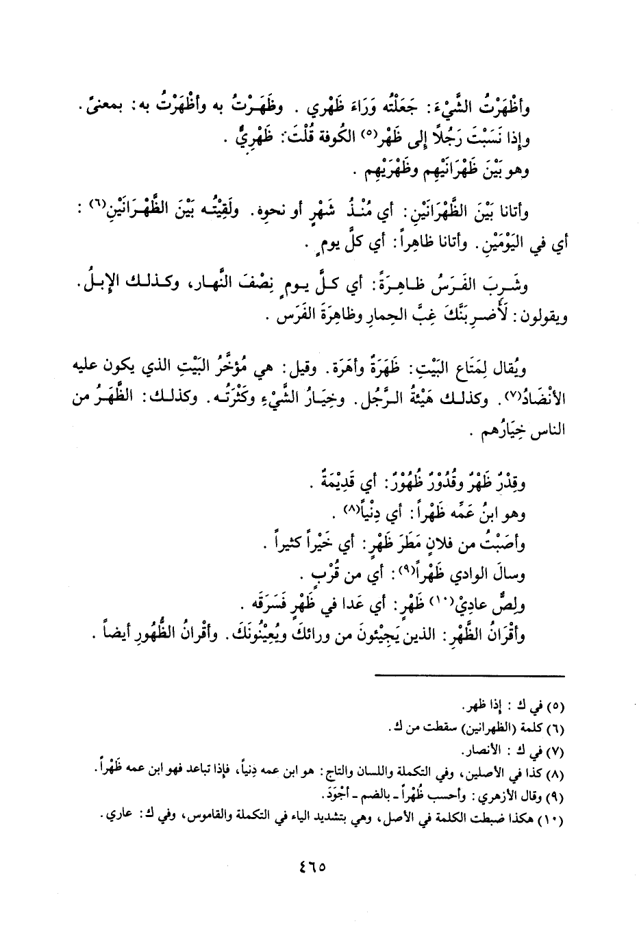 وأظْهَرْتُ الشَّيْءَ : جَعَلْتُه وَرَاءَ ظَهْري ، وظَهَرْتُ به وأظْهَرْتُ به : بمعنىً . وإذا نَسَبْتَ رَجُلاً إلى ظَهْر الكُوفة قُلْتَ : ظَهْرِيٌّ . وهو بَيْنَ ظَهْرَانَيْهِم وظَهْرَيْهِم . وأتانا بَيْنَ الظَّهْرَانَيْنِ : أي مُنْذُ شَهْرٍ أو نحوِه ، ولَقِيْتُه بَيْنَ الظَّهْرَانَيْنِ : أي في اليَوْمَيْنِ ، وأتانا ظاهِراً : أي كلَّ يومٍ . وشَرَبَ الفَرَسُ ظاهِرَةً : أي كلَّ يومٍ نِصْفَ النَّهار ، وكذلك الإبلُ . ويقولون : لأَضرِبَنَّكَ غِبَّ الحِمارِ وظاهِرَةَ الفَرَس . ويُقال لِمَتَاع البَيْتِ : ظَهَرَةٌ وأهَرَةٌ . وقيل : هي مُؤخَّرُ البَيْتِ الذي يكون عليه الأنْضَادُ ، وكذلك هَيْئةُ الرَّجُل ، وخِيَارُ الشَّيْءِ وكَثْرَتُه ، وكذلك : الظَّهَرُ من الناس خِيَارُهم . وقِدْرٌ ظَهْرٌ وقُدُْورٌ ظُهُوْرٌ : أي قَدِيْمَةٌ . وهو ابنُ عمِّه ظَهْراً : أي دِنْياً . وأصَبْتُ من فلانٍ مَطَرَ ظَهْرٍ : أي خَيْراً كثيراً . وسالَ الوادي ظَهْراً : أي من قُرْبٍ . ولِصٌّ عادِيْ ظَهْرٍ : أي عَدا في ظَهْرٍ فَسَرَقَه . وأقْرَانُ الظَّهْرِ : الذين يَجِيْئونَ من ورائكَ ويُعِيْنُونَكَ ، وأقْرانُ الظُّهُورِ أيضاً . والظُّهَارِيَّةُ