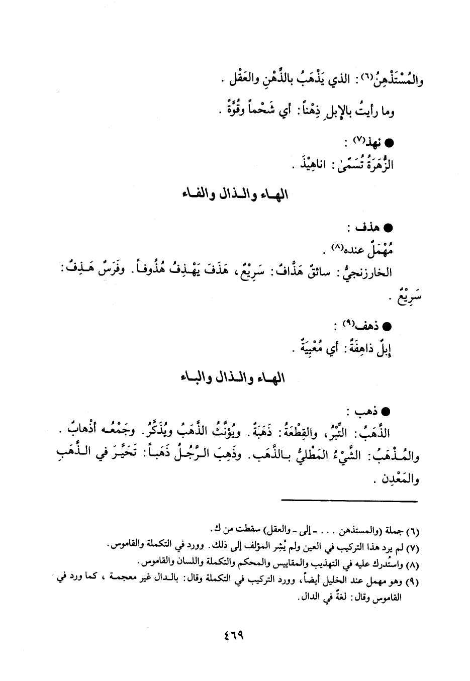 هذف مُهْمَلٌ عنده . والخارزنجي : سائقٌ هَذَّافٌ : سَرِيْعٌ ، هَذَفَ يَهْذِفُ هُذُوفاً ، وفَرَسٌ هَذِفٌ : سَرِيْعٌ . ذهف إيلٌ ذاهِفَةٌ : أي مُعْيِيَةٌ .