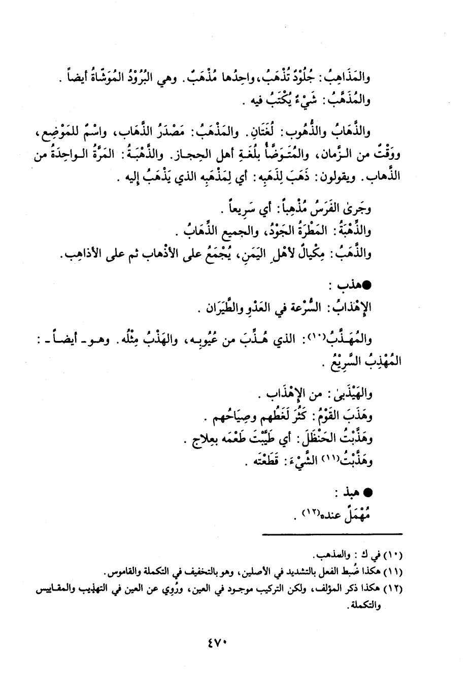 والمَذَاهِبُ : جُلُوْدٌ تُذَهْبُ ، واحِدُها مُذْهَبٌ ، وهي البُرُوْدُ المُوَشّاةُ أيضاً . والمُذَهَّبُ : شَيْءٌ يُكْتَبُ فيه . والذِّهَابُ والذُّهُوب : لُغَتَانِ . والمَذْهَبُ : مَصْدَرُ الذَّهَاب ، واسْمٌ للمَوْضِع ، ووَقْتٌ من الزَّمان ، والمُتَوَضَّأ بلُغَةِ أهل الحِجاز . والذَّهْبَةُ : المَرَّةُ الواحِدَةُ من الذَّهاب . ويقولون : ذَهَبَ لِذَهَبِه : أي لِمَذْهَبِه الذي يَذْهَبُ إليه . وجَرى الفَرَسُ مُذْهِباً : أي سَرِيعاً . والذِّهْبَةُ : المَطْرُة الجَوْدُ ، والجميع الذِّهَابُ . والذَّهَبُ : مِكْيالٌ لأهْلِ اليَمَنِ ، يُجْمَعُ على الأذْهاب ثم على الأذاهِب . هذب الإهْذابُ : السُّرْعة في العَدْوِ والطَّيَرَان . والمُهَذَّبُ : الذي هُذِّبَ من عُيُوبِه ، والهَذْبُ مِثْلُه . وهو - أيضاً - : المُهْذِبُ السَّرِيْعُ . والهَيْذَبى : من الإهْذَاب . وهَذَبَ القَوْمُ : كَثُرَ لَغَطُهم وصِيَاحُهم . وهَذَّبْتُ الحَنْظَلَ : أي طَيَّبْتَ طَعْمَه بعِلاج . وهَذَّبْتُ الشَّيْءَ : قَطَعْتَه . هبذ مُهْمَلٌ عنده .